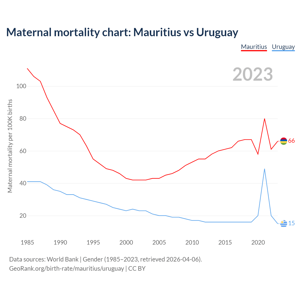 The maternal mortality rate, which is the probability of dying during childbirth or within 42 days of pregnancy termination, is 66 deaths per 100,000 live births in Mauritius, compared to 15 deaths in Uruguay.