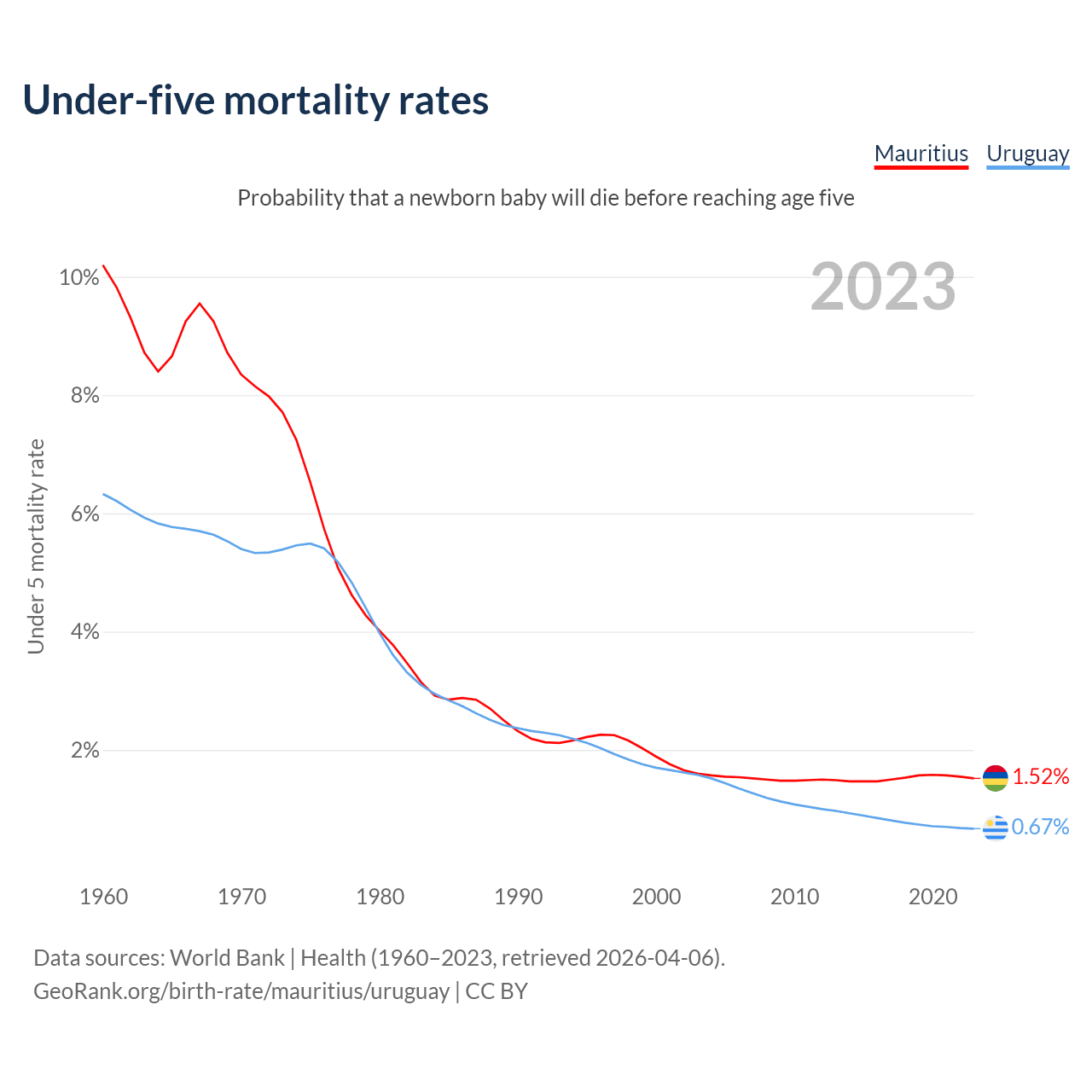The chance that a newborn baby will die before reaching age five is 1.52% in Mauritius and 0.67% in Uruguay. Above is a chart with historical data on under-five mortality rates.