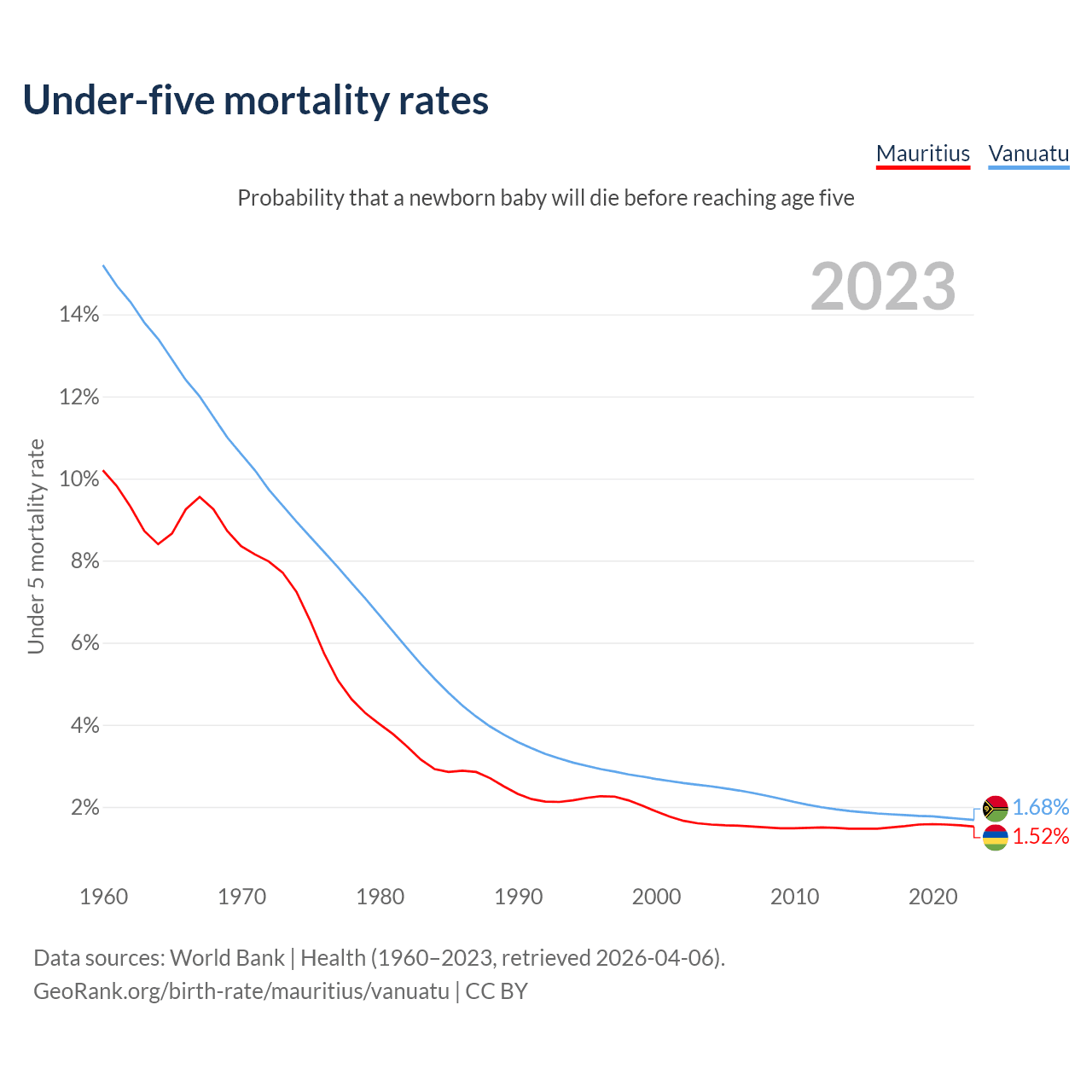 The chance that a newborn baby will die before reaching age five is 1.52% in Mauritius and 1.68% in Vanuatu. Above is a chart with historical data on under-five mortality rates.