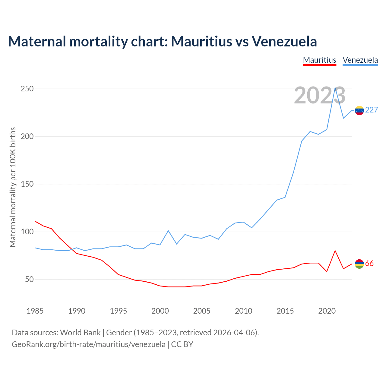 The maternal mortality rate, which is the probability of dying during childbirth or within 42 days of pregnancy termination, is 66 deaths per 100,000 live births in Mauritius, compared to 227 deaths in Venezuela.