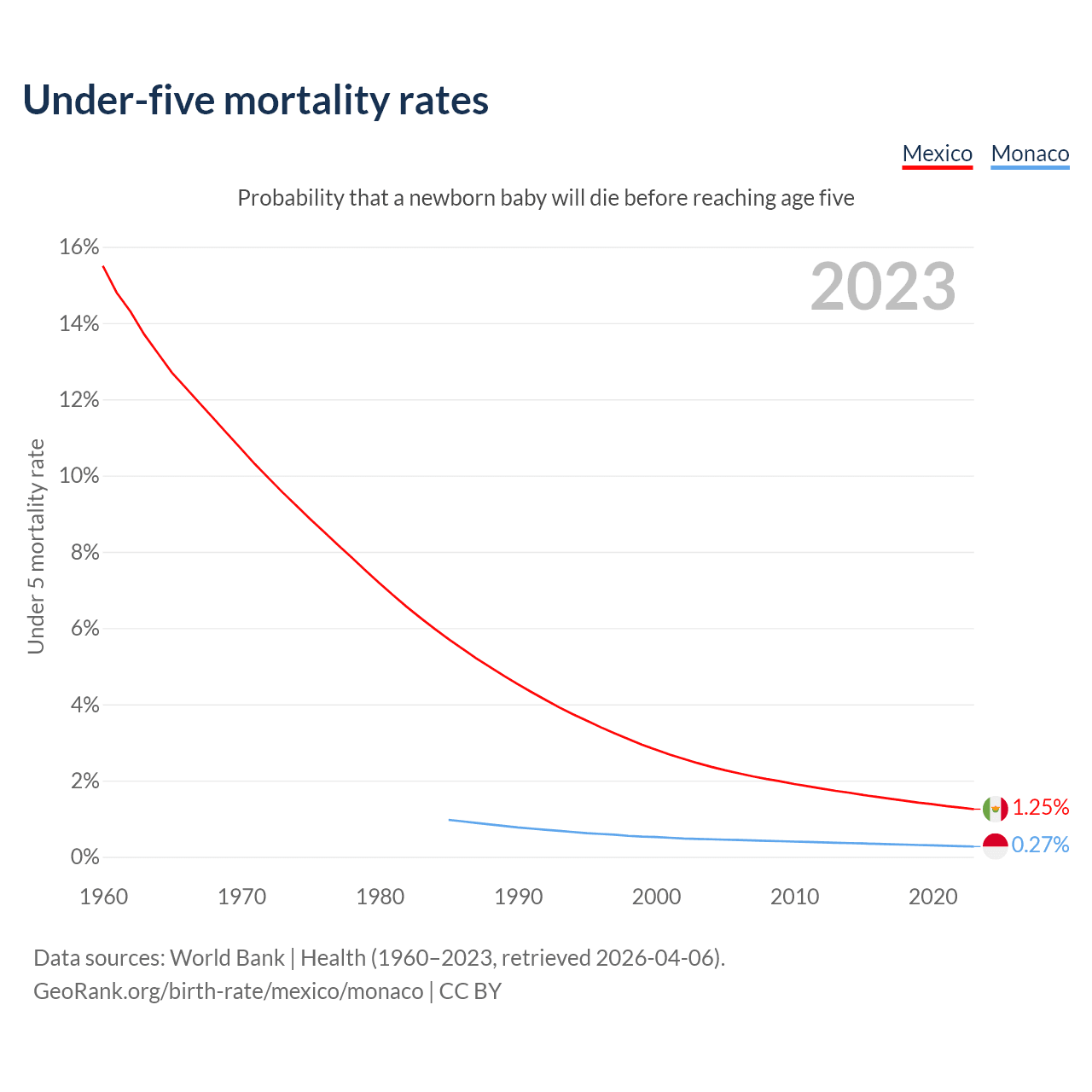 The chance that a newborn baby will die before reaching age five is 1.25% in Mexico and 0.27% in Monaco. Above is a chart with historical data on under-five mortality rates.