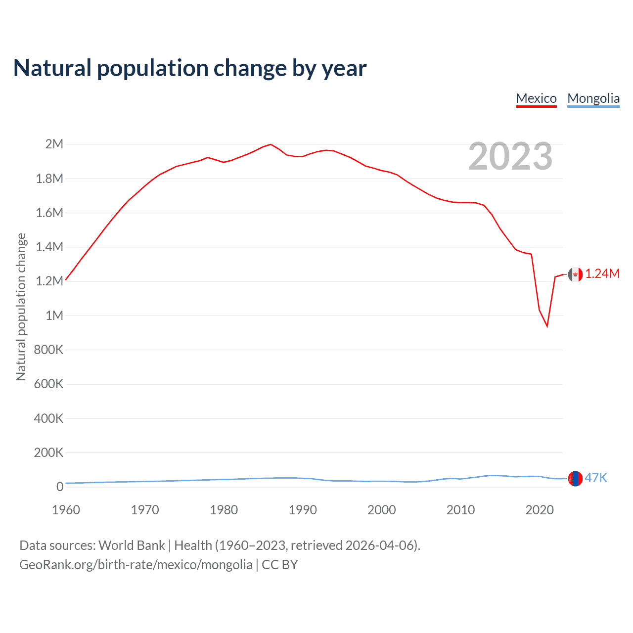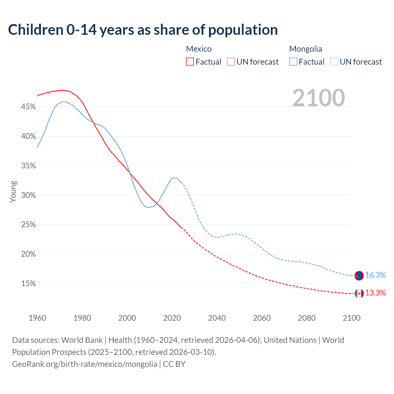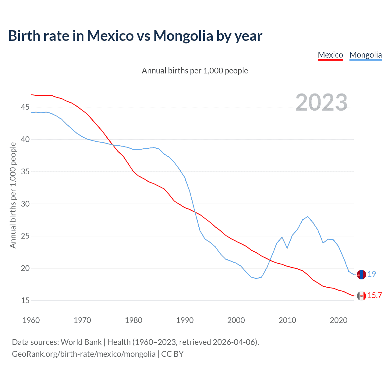 According to the latest available data on birth rates, the fertility rate in Mexico was 1.91 children per woman in 2023, compared to 2.7 in Mongolia in 2023. The replacement level is considered to be 2.1 children per woman.