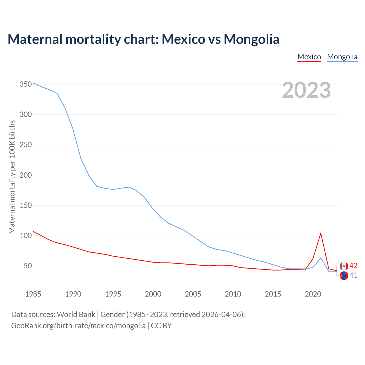 The maternal mortality rate, which is the probability of dying during childbirth or within 42 days of pregnancy termination, is 42 deaths per 100,000 live births in Mexico, compared to 41 deaths in Mongolia.