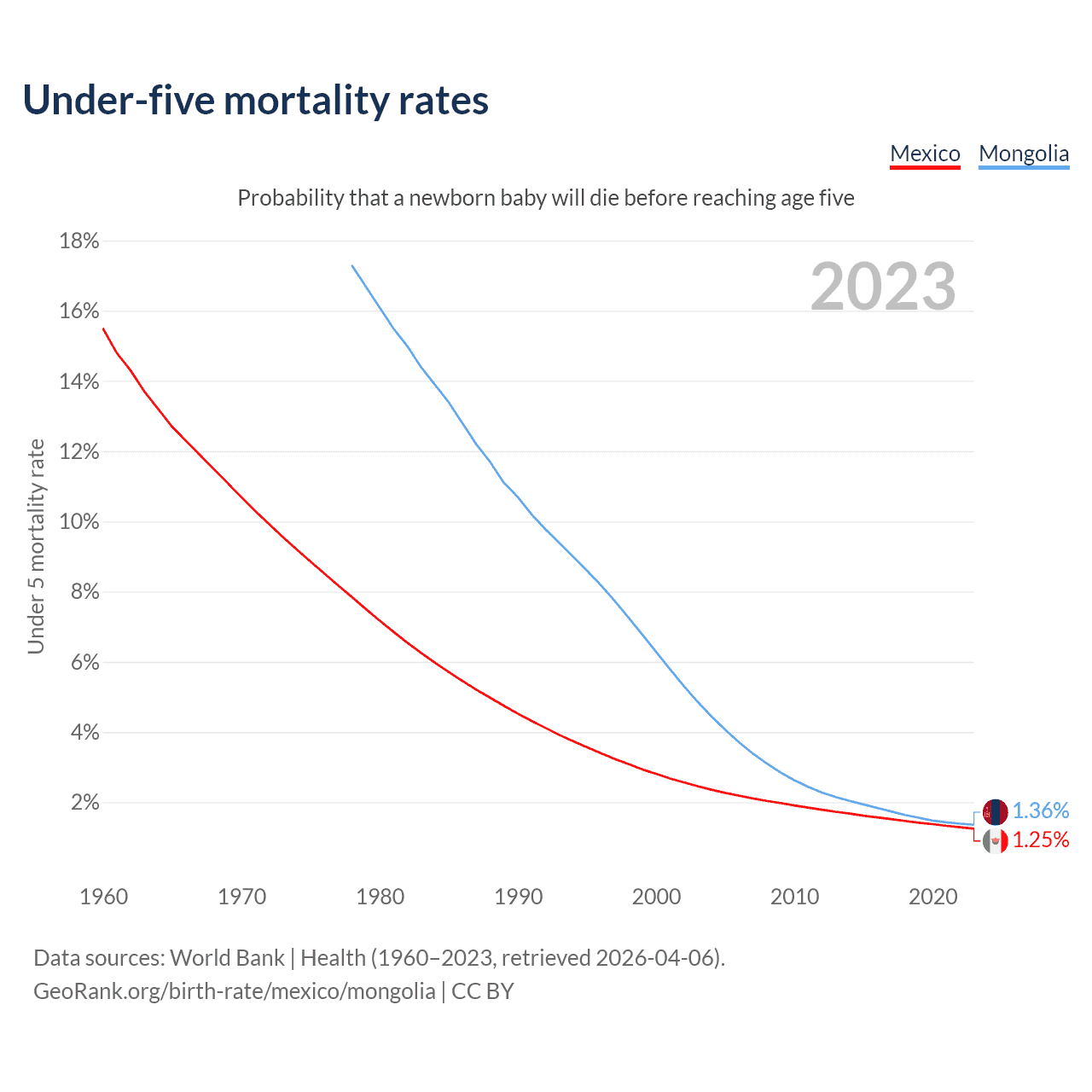 The chance that a newborn baby will die before reaching age five is 1.25% in Mexico and 1.36% in Mongolia. Above is a chart with historical data on under-five mortality rates.