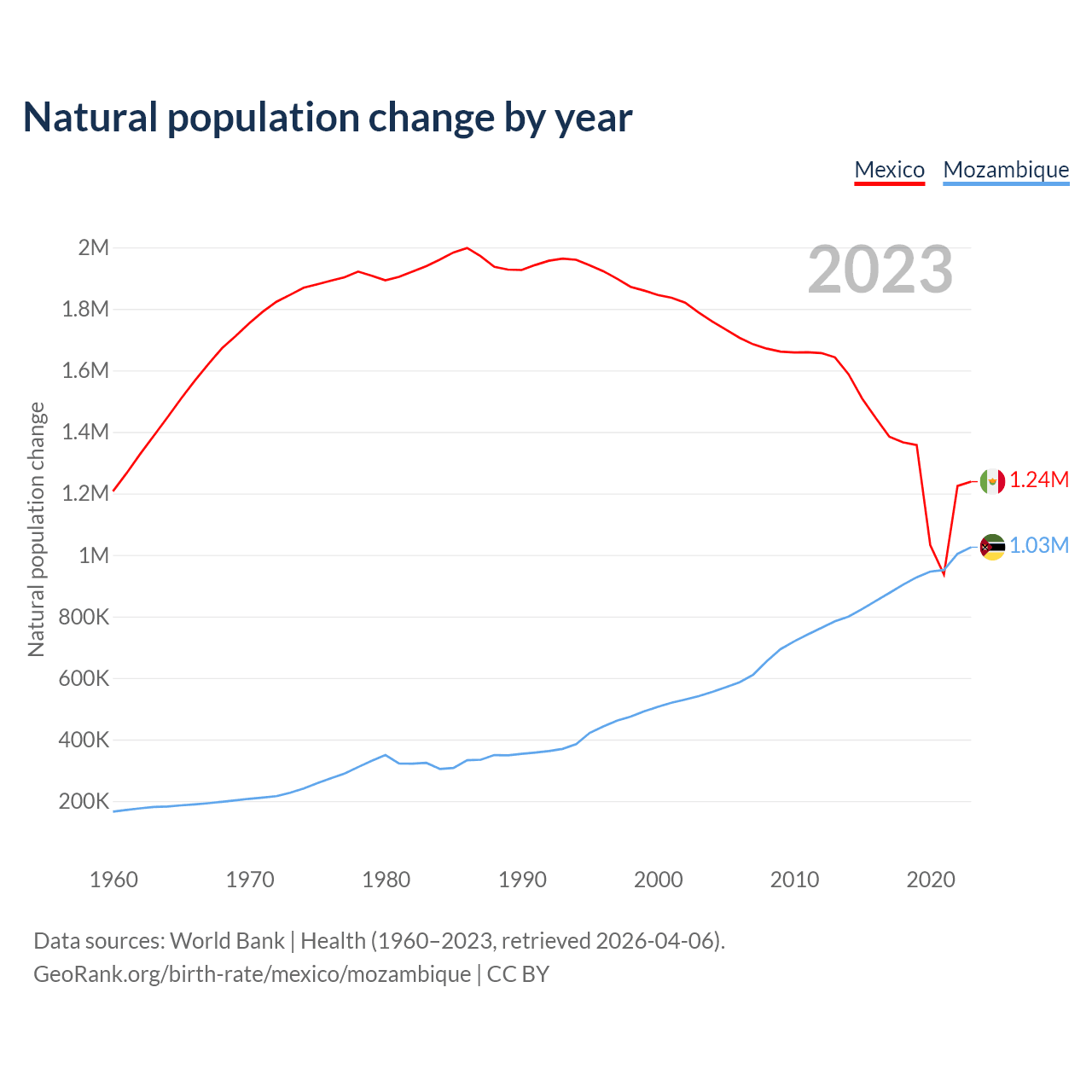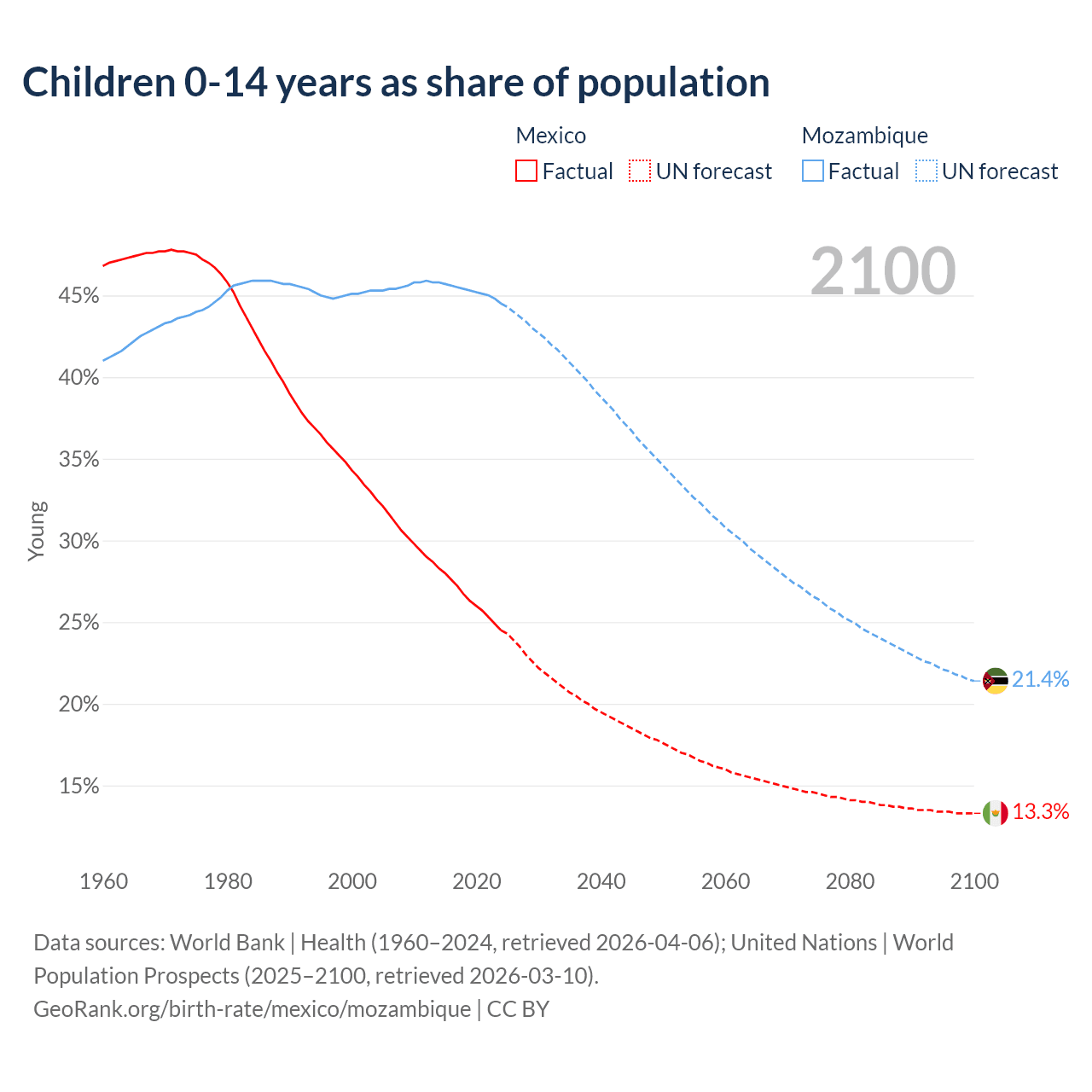 According to the latest available data on birth rates, the fertility rate in Mexico was 1.91 children per woman in 2023, compared to 4.76 in Mozambique in 2023. The replacement level is considered to be 2.1 children per woman.