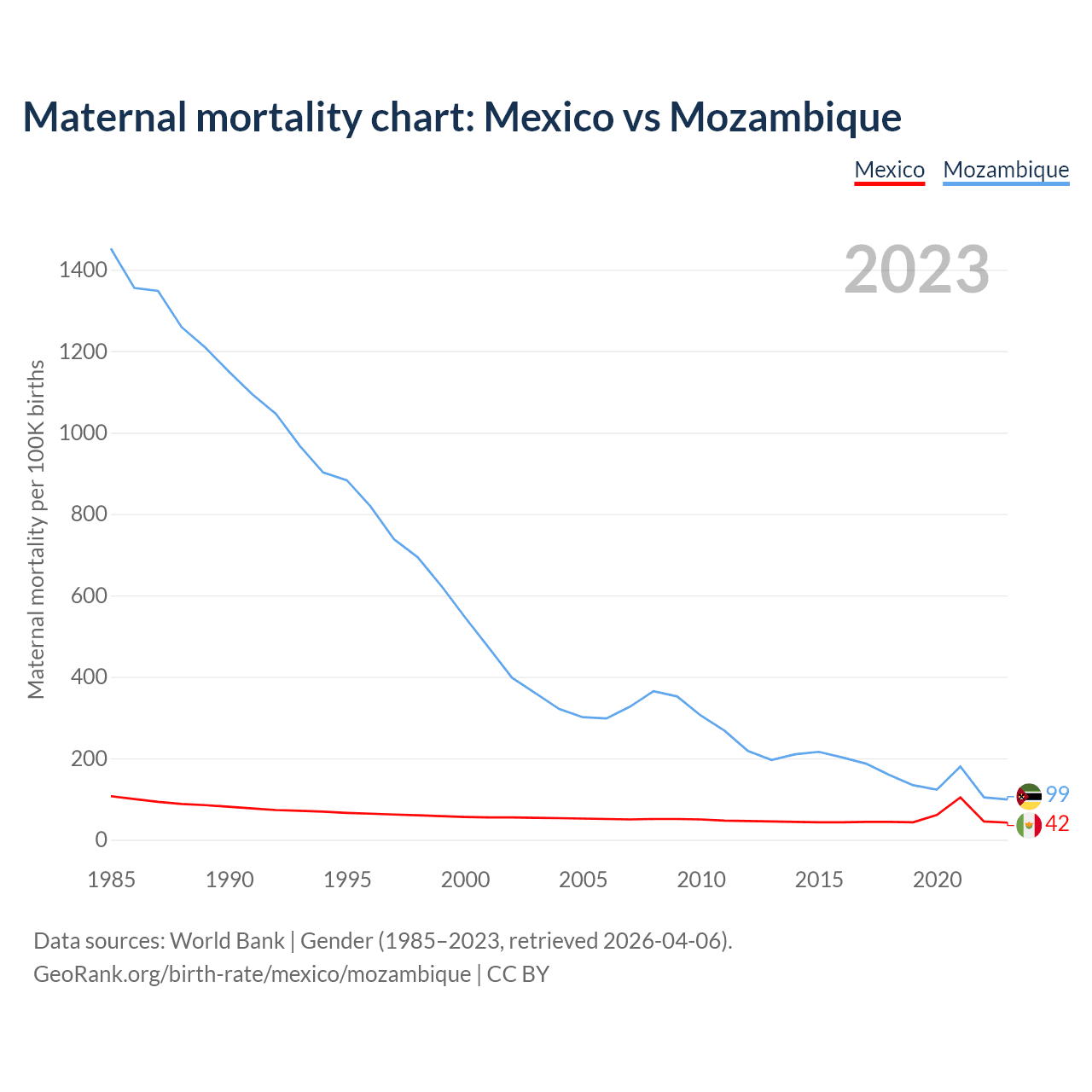 The maternal mortality rate, which is the probability of dying during childbirth or within 42 days of pregnancy termination, is 42 deaths per 100,000 live births in Mexico, compared to 99 deaths in Mozambique.
