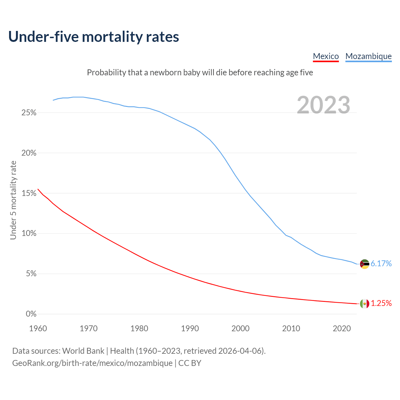 The chance that a newborn baby will die before reaching age five is 1.25% in Mexico and 6.17% in Mozambique. Above is a chart with historical data on under-five mortality rates.