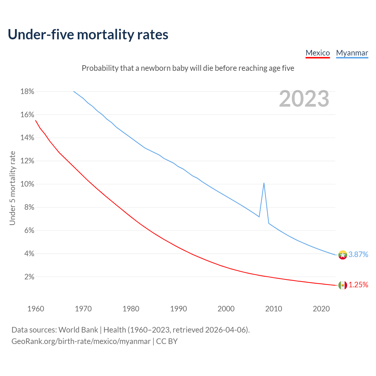 The chance that a newborn baby will die before reaching age five is 1.25% in Mexico and 3.87% in Myanmar. Above is a chart with historical data on under-five mortality rates.