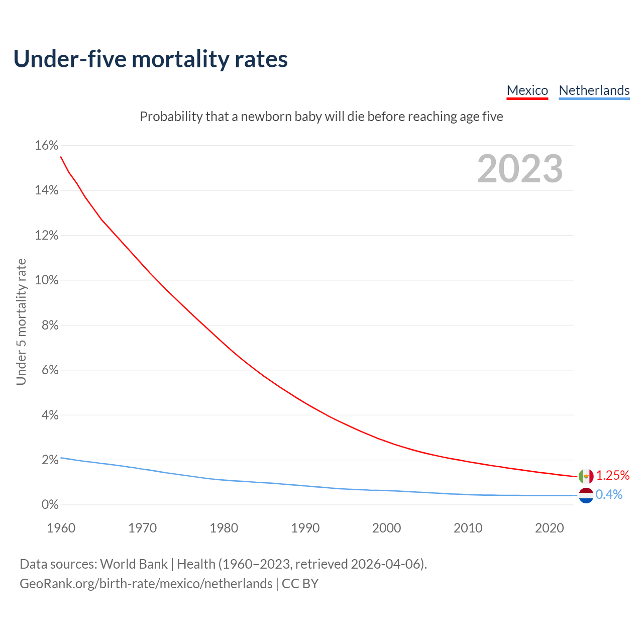 The chance that a newborn baby will die before reaching age five is 1.25% in Mexico and 0.4% in the Netherlands. Above is a chart with historical data on under-five mortality rates.