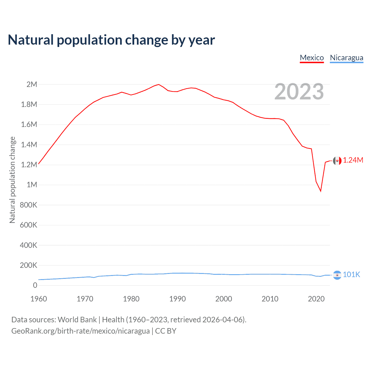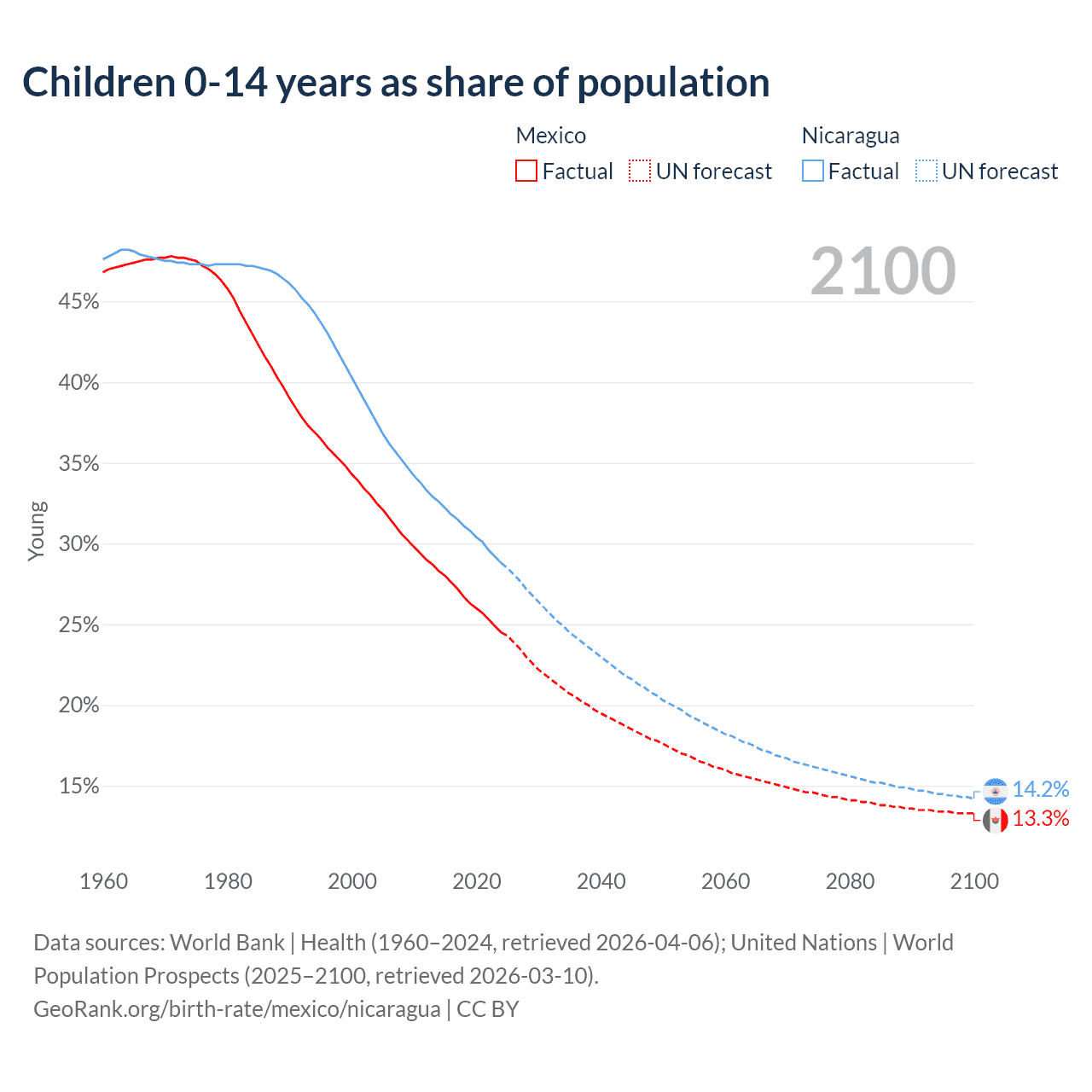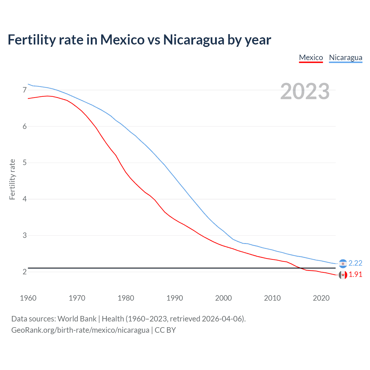 According to the latest available data on birth rates, the fertility rate in Mexico was 1.91 children per woman in 2023, compared to 2.22 in Nicaragua in 2023. The replacement level is considered to be 2.1 children per woman.