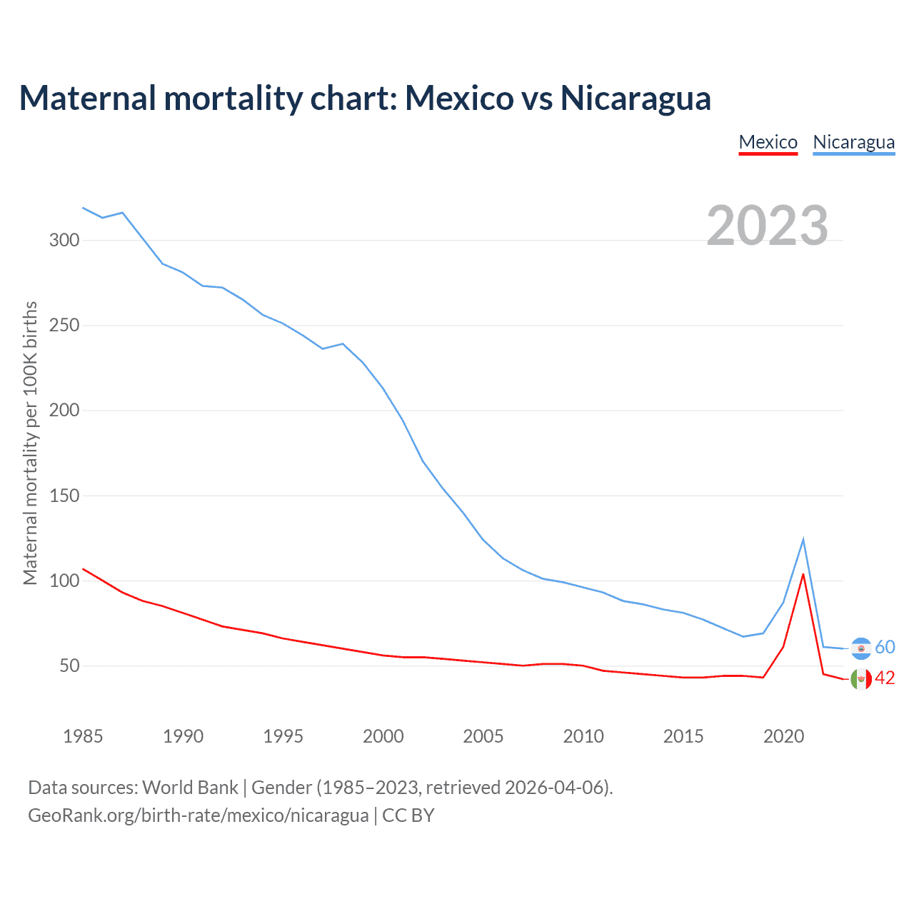 The maternal mortality rate, which is the probability of dying during childbirth or within 42 days of pregnancy termination, is 42 deaths per 100,000 live births in Mexico, compared to 60 deaths in Nicaragua.