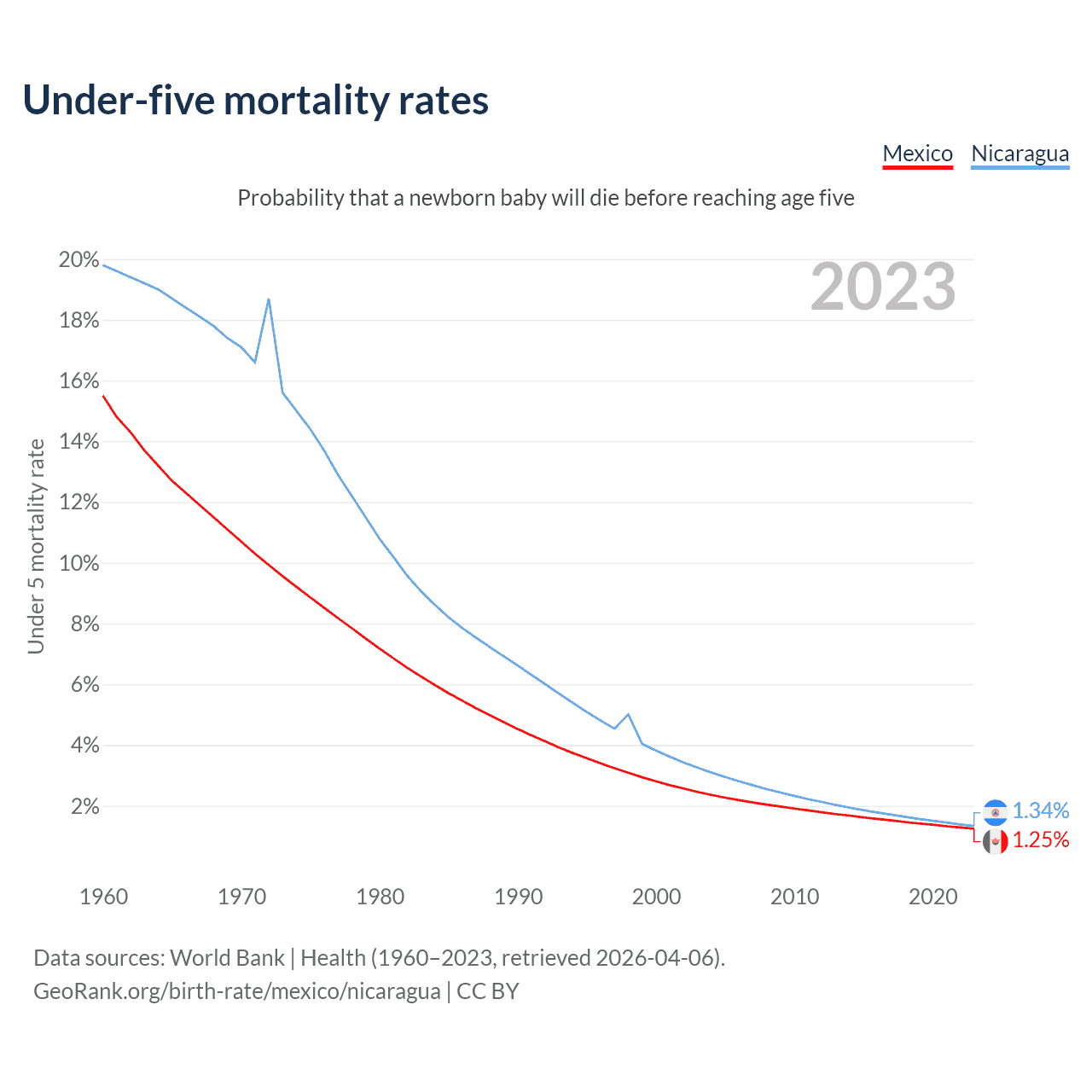 The chance that a newborn baby will die before reaching age five is 1.25% in Mexico and 1.34% in Nicaragua. Above is a chart with historical data on under-five mortality rates.