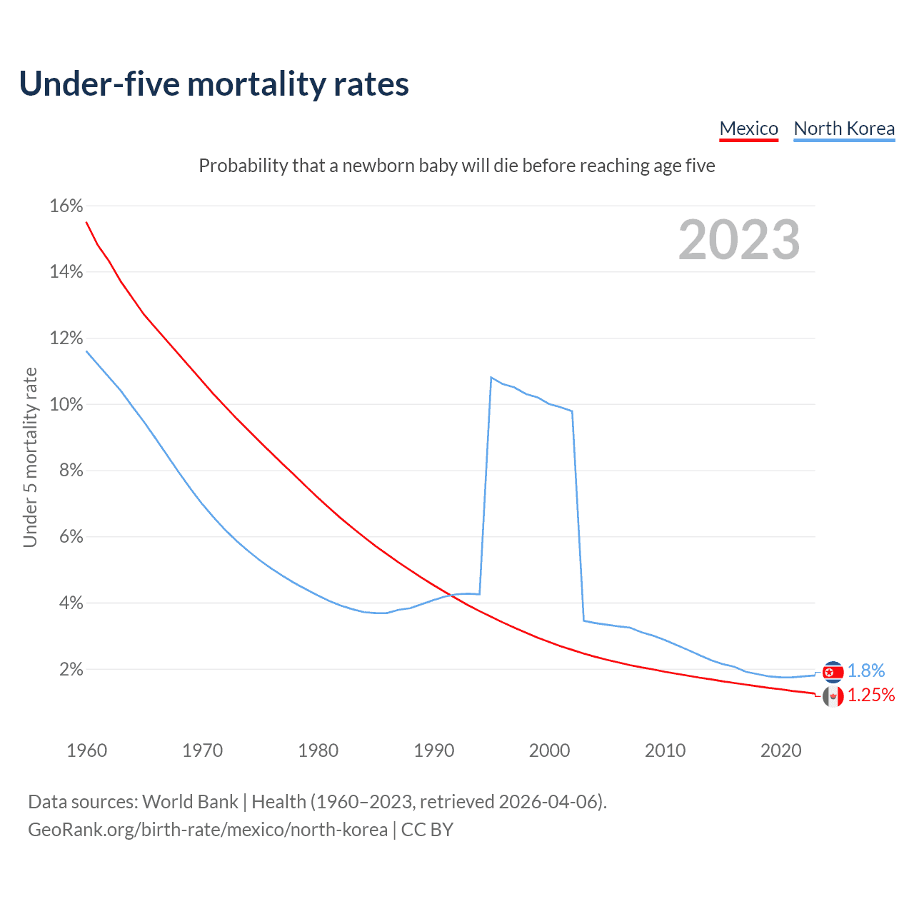 The chance that a newborn baby will die before reaching age five is 1.25% in Mexico and 1.8% in North Korea. Above is a chart with historical data on under-five mortality rates.