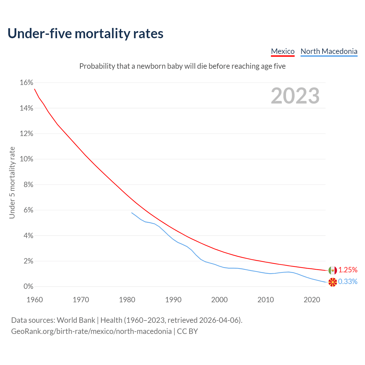 The chance that a newborn baby will die before reaching age five is 1.25% in Mexico and 0.33% in North Macedonia. Above is a chart with historical data on under-five mortality rates.