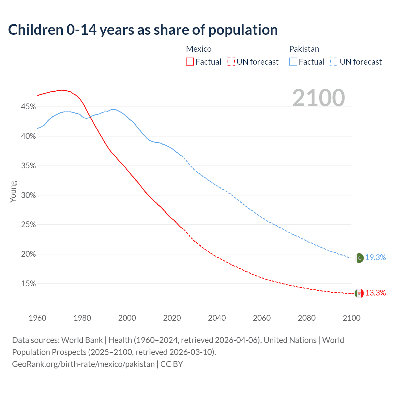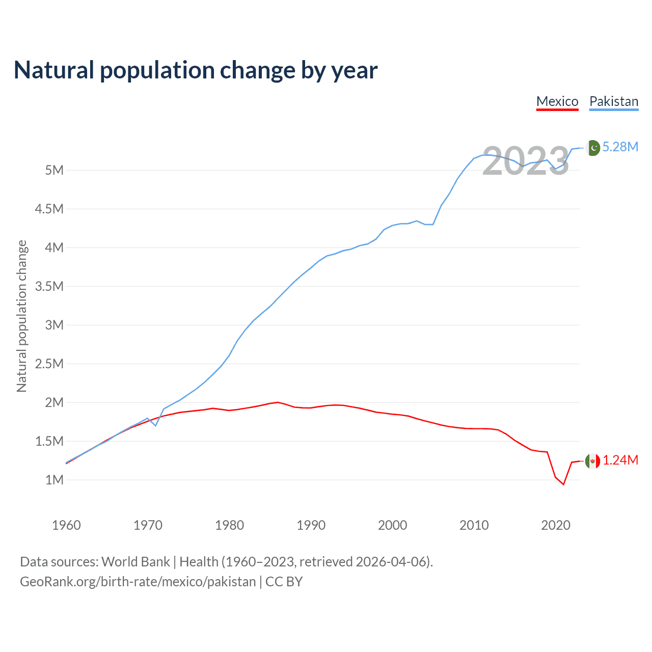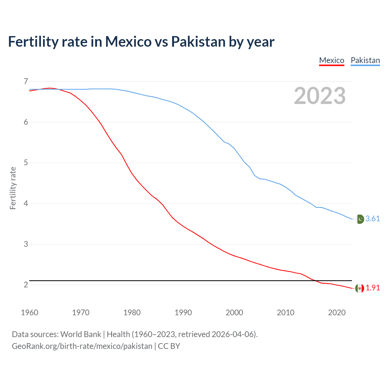According to the latest available data on birth rates, the fertility rate in Mexico was 1.91 children per woman in 2023, compared to 3.61 in Pakistan in 2023. The replacement level is considered to be 2.1 children per woman.