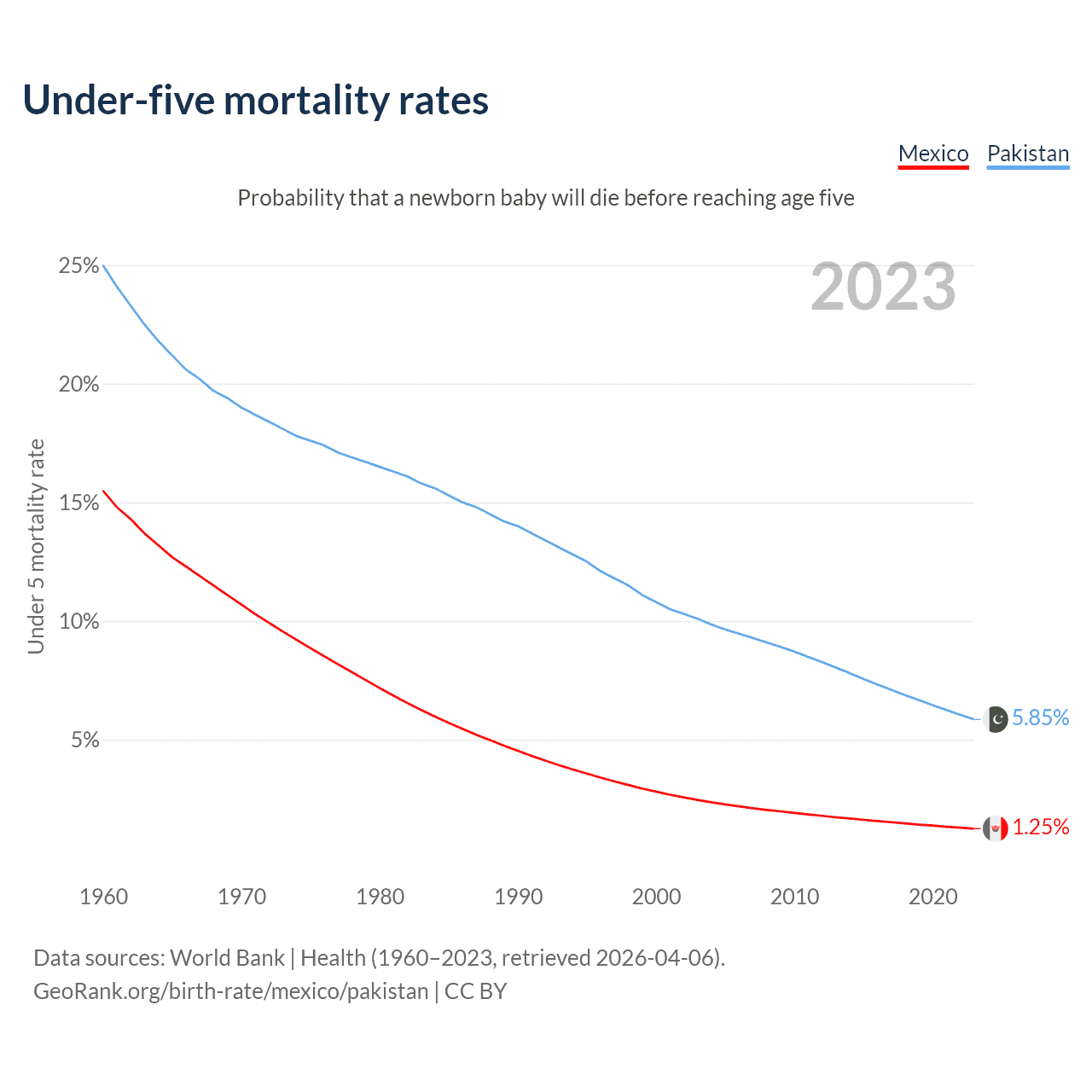 The chance that a newborn baby will die before reaching age five is 1.25% in Mexico and 5.85% in Pakistan. Above is a chart with historical data on under-five mortality rates.