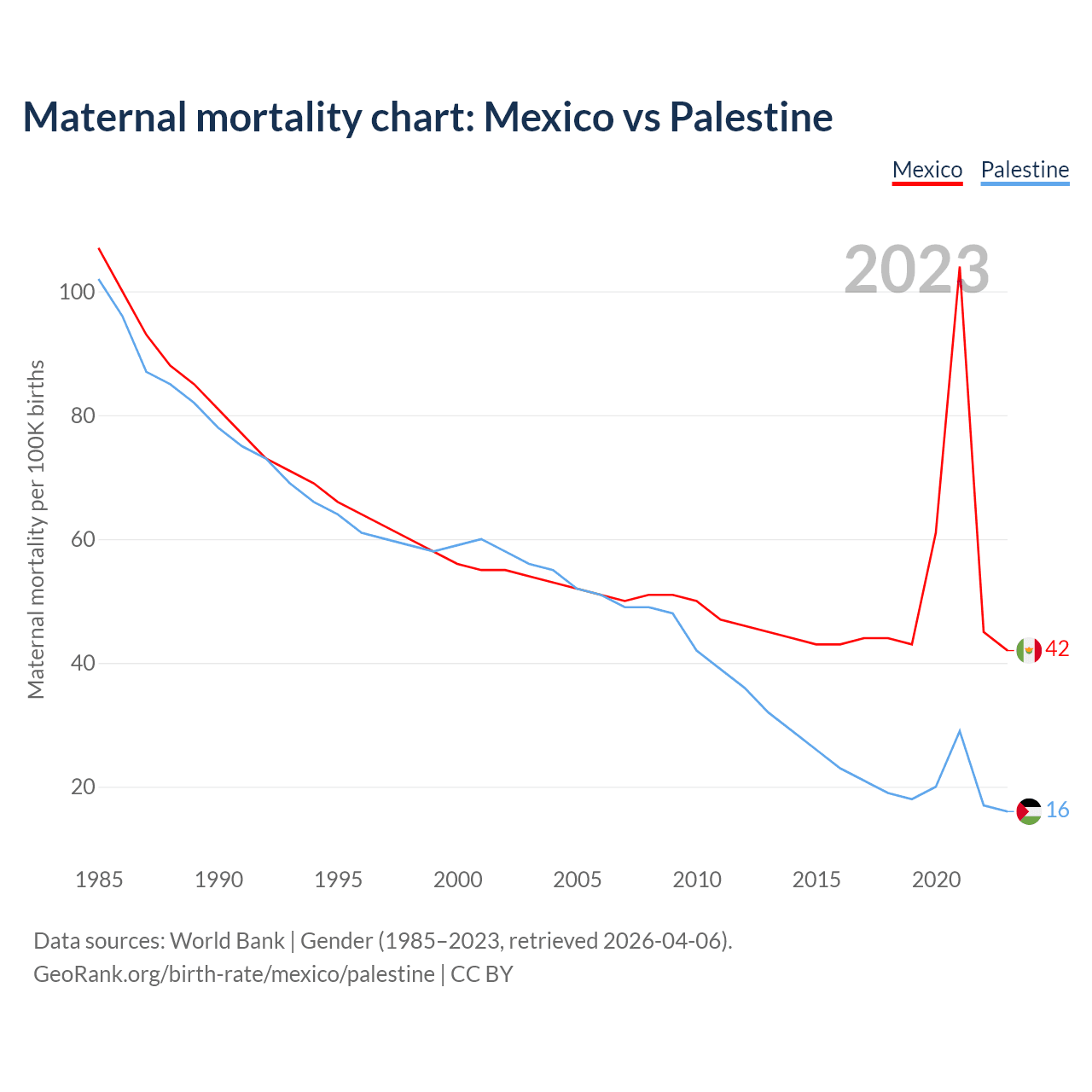 The maternal mortality rate, which is the probability of dying during childbirth or within 42 days of pregnancy termination, is 42 deaths per 100,000 live births in Mexico, compared to 16 deaths in Palestine.