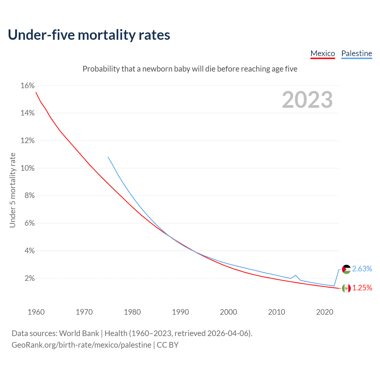 The chance that a newborn baby will die before reaching age five is 1.25% in Mexico and 2.63% in Palestine. Above is a chart with historical data on under-five mortality rates.