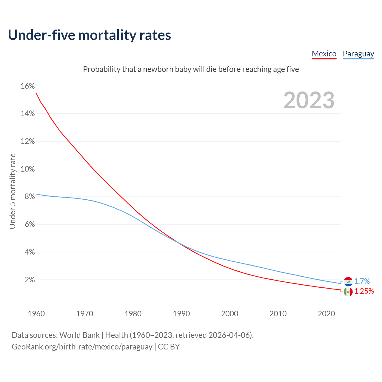 The chance that a newborn baby will die before reaching age five is 1.25% in Mexico and 1.7% in Paraguay. Above is a chart with historical data on under-five mortality rates.