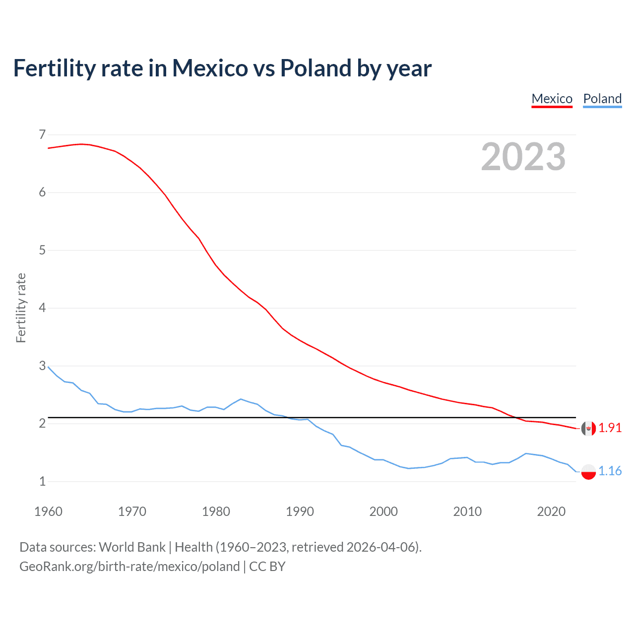 According to the latest available data on birth rates, the fertility rate in Mexico was 1.91 children per woman in 2023, compared to 1.16 in Poland in 2023. The replacement level is considered to be 2.1 children per woman.