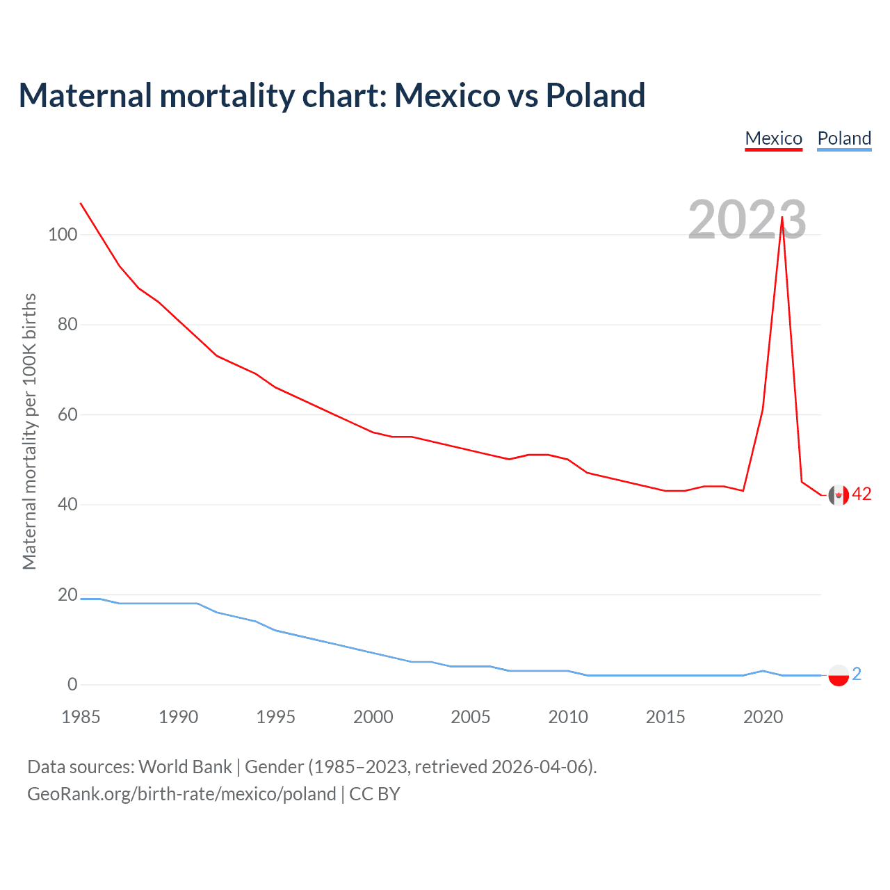 The maternal mortality rate, which is the probability of dying during childbirth or within 42 days of pregnancy termination, is 42 deaths per 100,000 live births in Mexico, compared to 2 deaths in Poland.