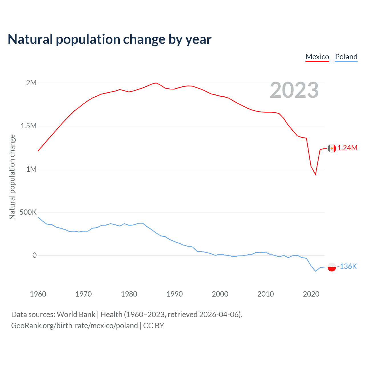Mexico has an annual birth rate of 15.7 births per 1,000 people, compared to 7.4 for Poland. The average number of children a woman is expected to have during her lifetime — the fertility rate, is 1.91 in Mexico and 1.16 in Poland — 39.4% difference.