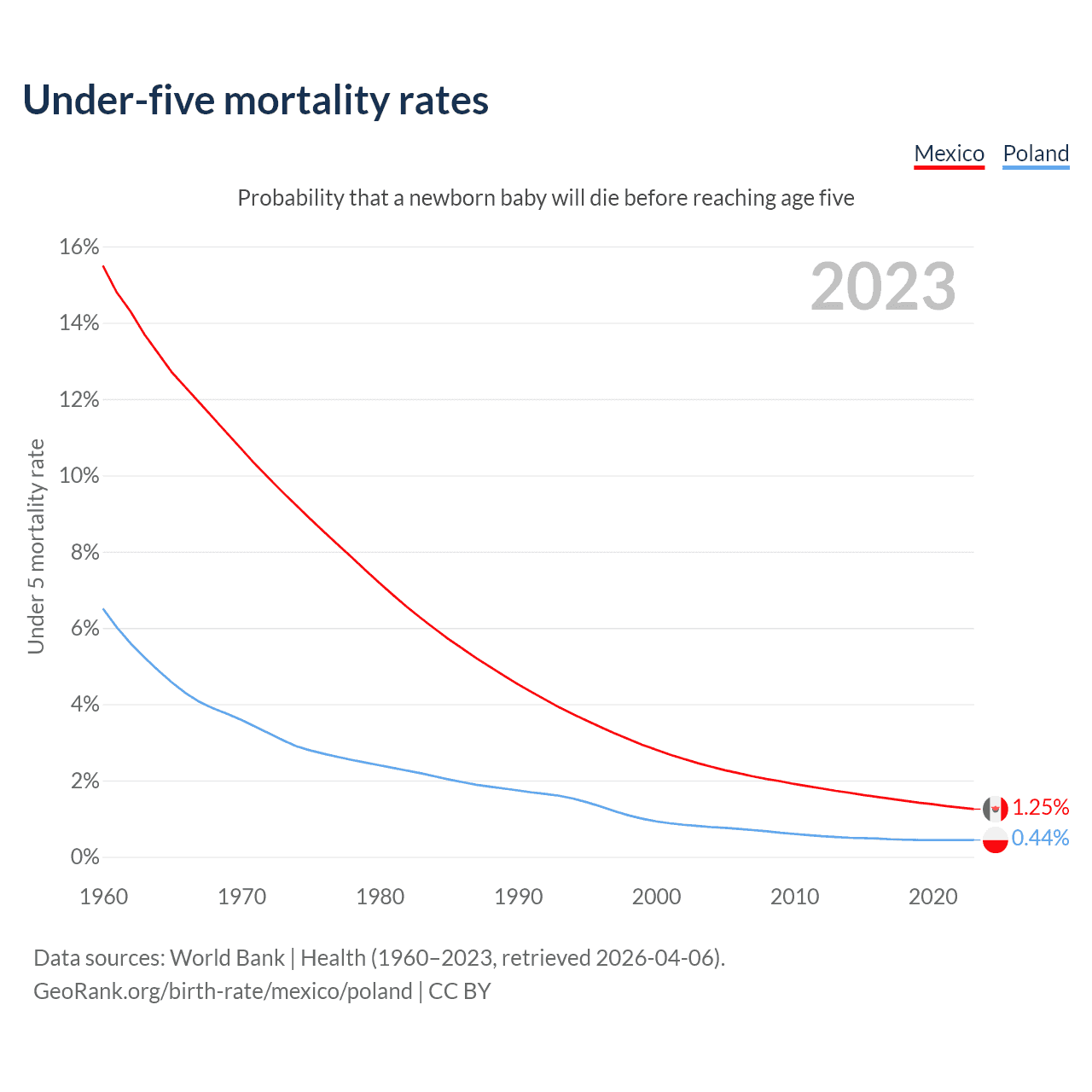 The chance that a newborn baby will die before reaching age five is 1.25% in Mexico and 0.44% in Poland. Above is a chart with historical data on under-five mortality rates.