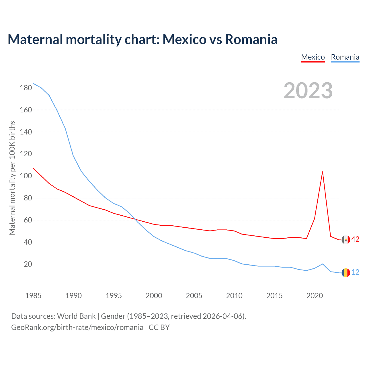 The maternal mortality rate, which is the probability of dying during childbirth or within 42 days of pregnancy termination, is 42 deaths per 100,000 live births in Mexico, compared to 12 deaths in Romania.