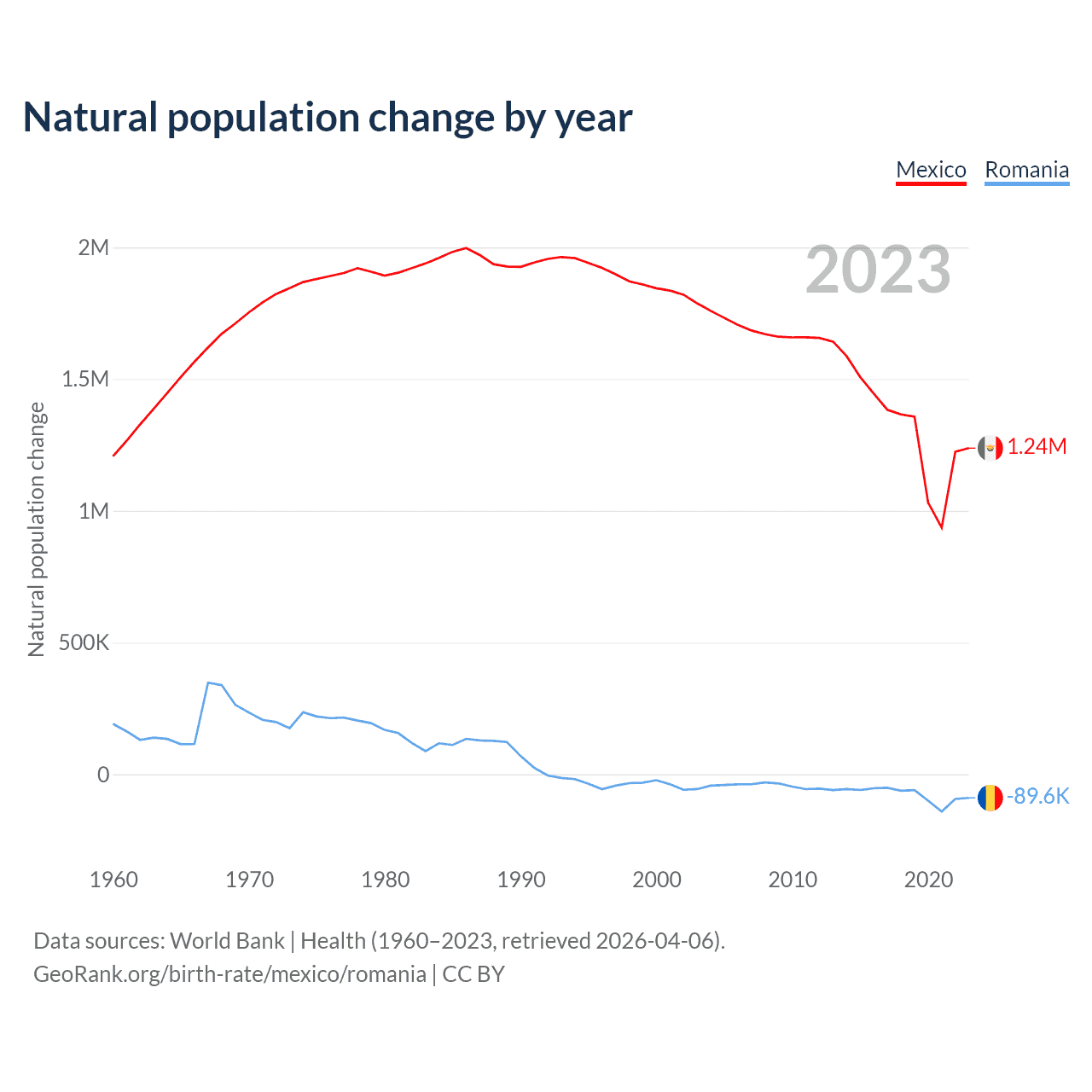 According to the latest available data on birth rates, the fertility rate in Mexico was 1.91 children per woman in 2023, compared to 1.71 in Romania in 2023. The replacement level is considered to be 2.1 children per woman.