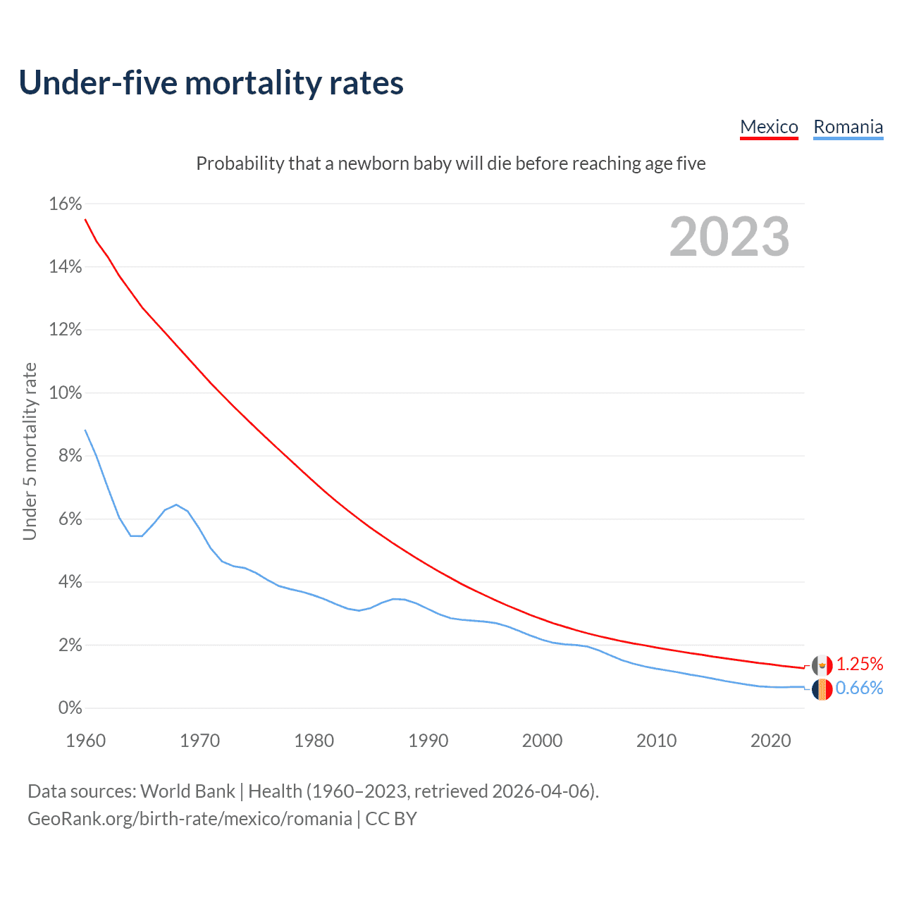 The chance that a newborn baby will die before reaching age five is 1.25% in Mexico and 0.66% in Romania. Above is a chart with historical data on under-five mortality rates.