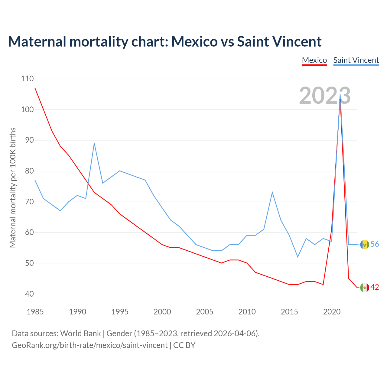 The maternal mortality rate, which is the probability of dying during childbirth or within 42 days of pregnancy termination, is 42 deaths per 100,000 live births in Mexico, compared to 56 deaths in Saint Vincent.