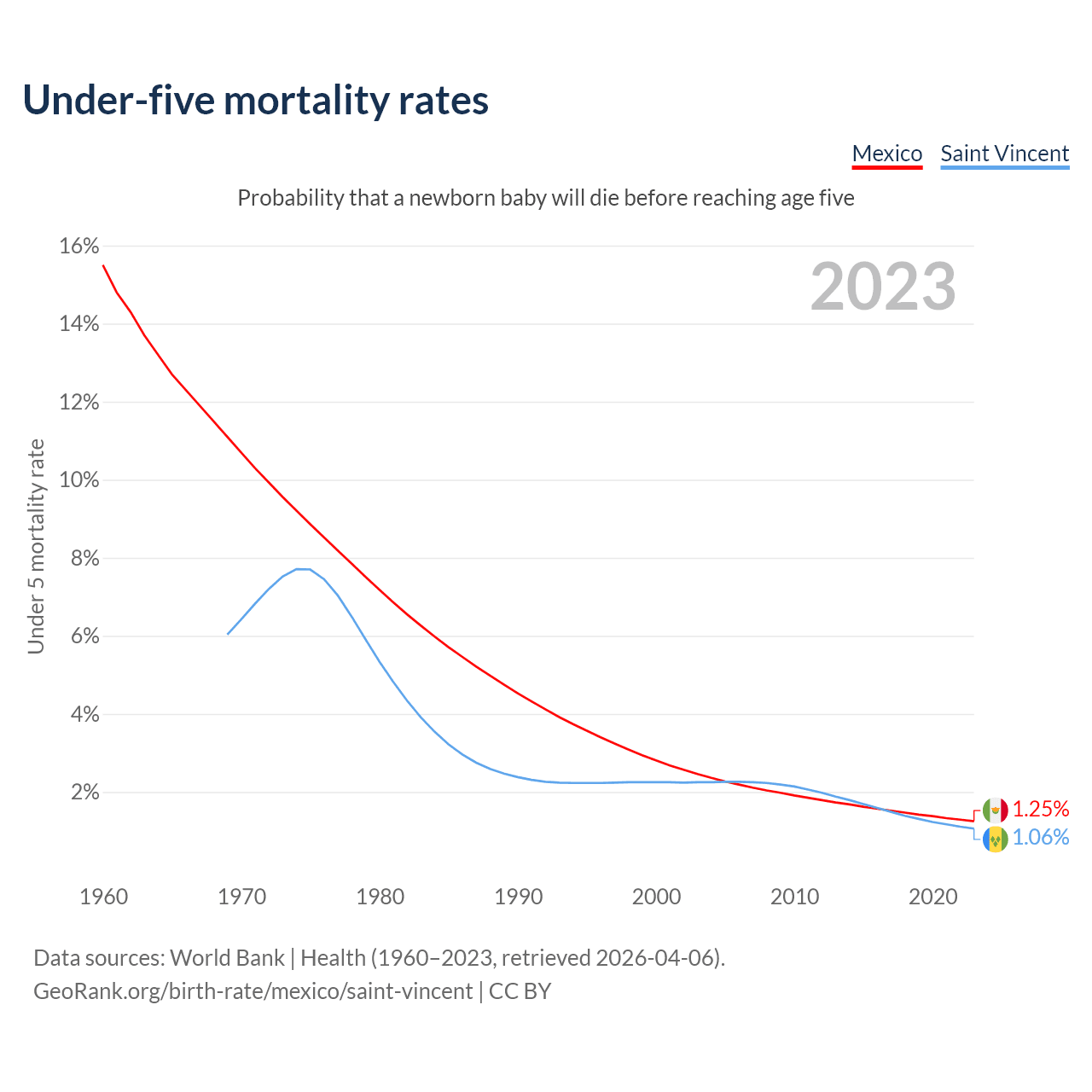 The chance that a newborn baby will die before reaching age five is 1.25% in Mexico and 1.06% in Saint Vincent. Above is a chart with historical data on under-five mortality rates.