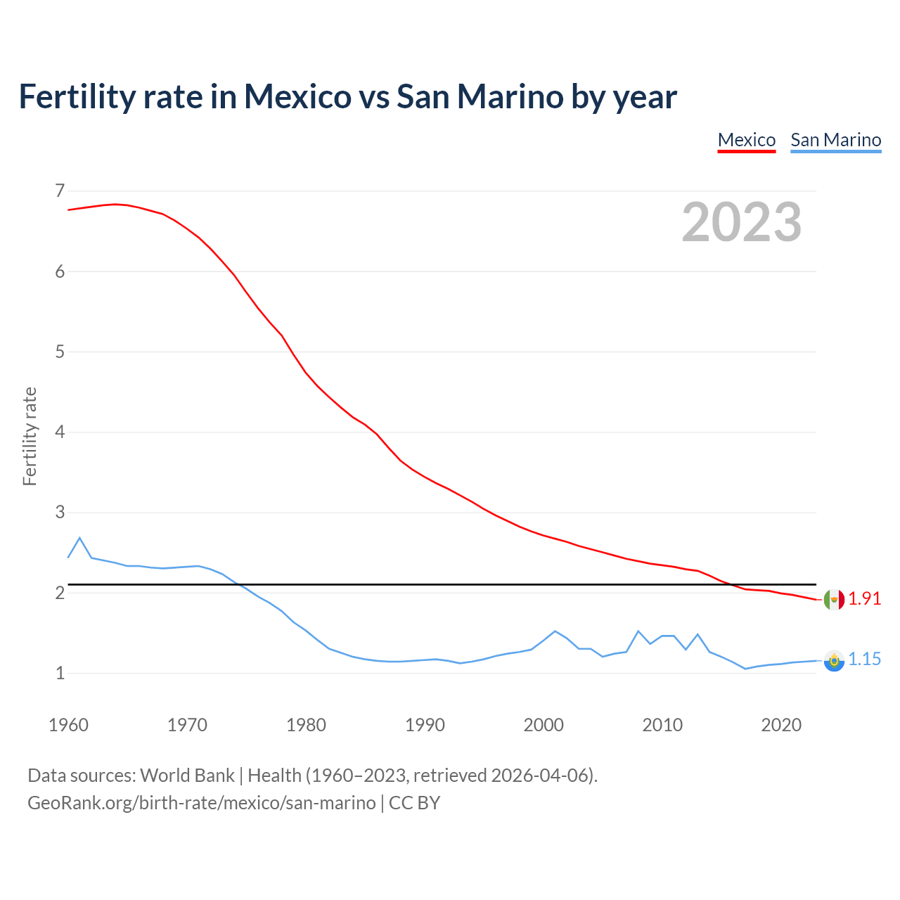 According to the latest available data on birth rates, the fertility rate in Mexico was 1.91 children per woman in 2023, compared to 1.15 in San Marino in 2023. The replacement level is considered to be 2.1 children per woman.