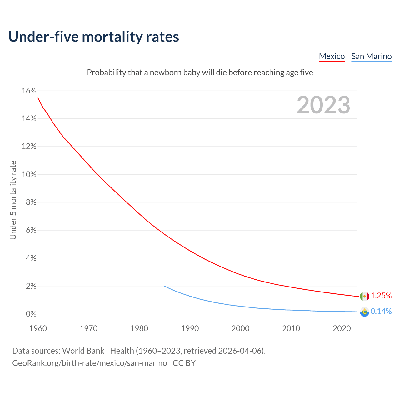 The chance that a newborn baby will die before reaching age five is 1.25% in Mexico and 0.14% in San Marino. Above is a chart with historical data on under-five mortality rates.