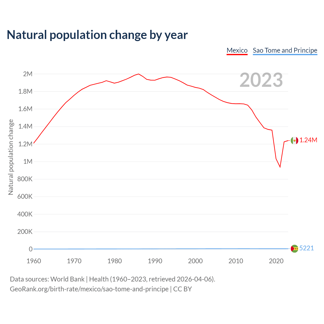 Mexico has an annual birth rate of 15.7 births per 1,000 people, compared to 28.2 for Sao Tome and Principe. The average number of children a woman is expected to have during her lifetime — the fertility rate, is 1.91 in Mexico and 3.64 in Sao Tome and Principe — 90.8% difference.