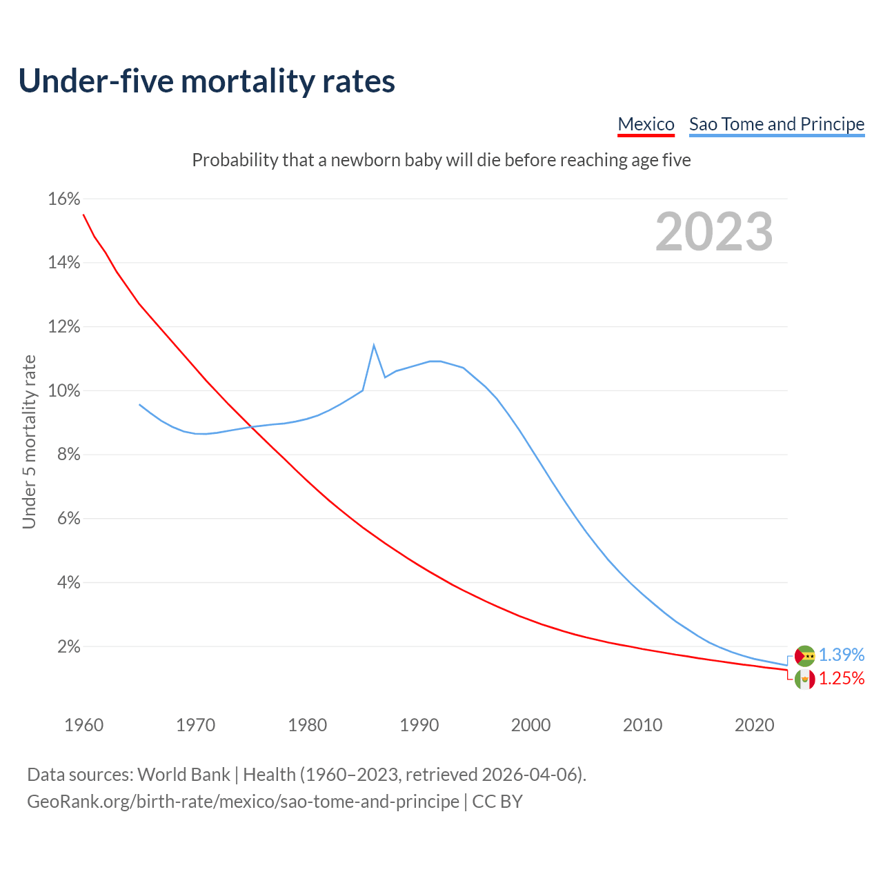 The chance that a newborn baby will die before reaching age five is 1.25% in Mexico and 1.39% in Sao Tome and Principe. Above is a chart with historical data on under-five mortality rates.