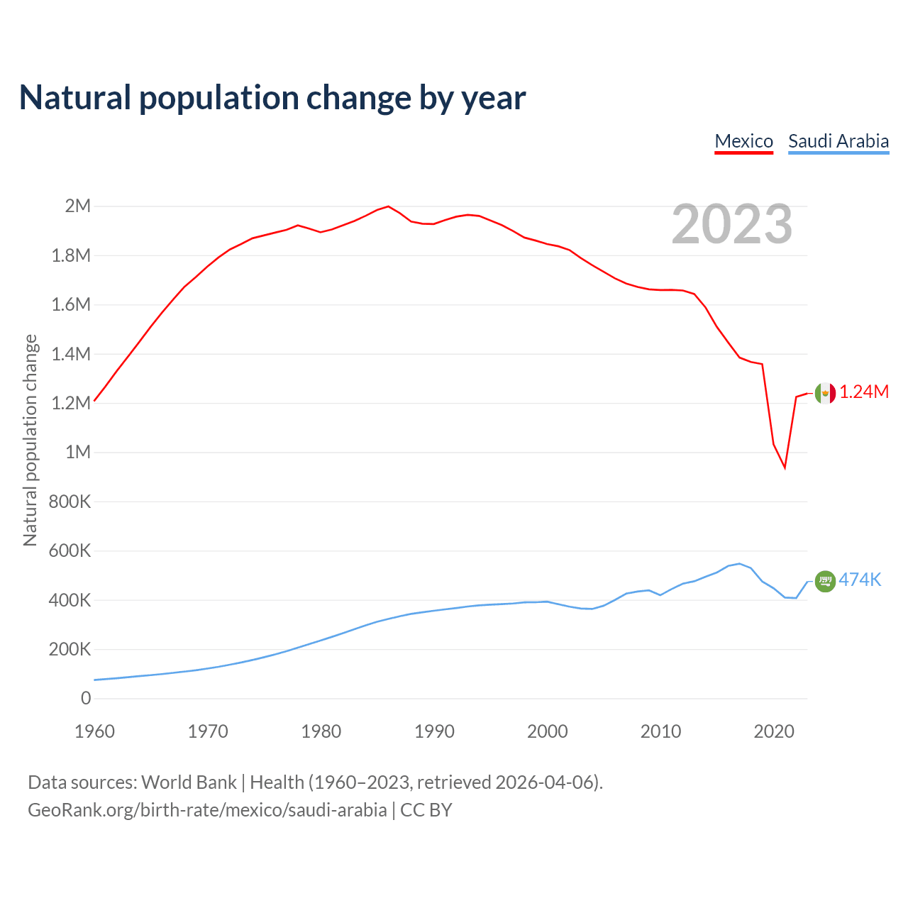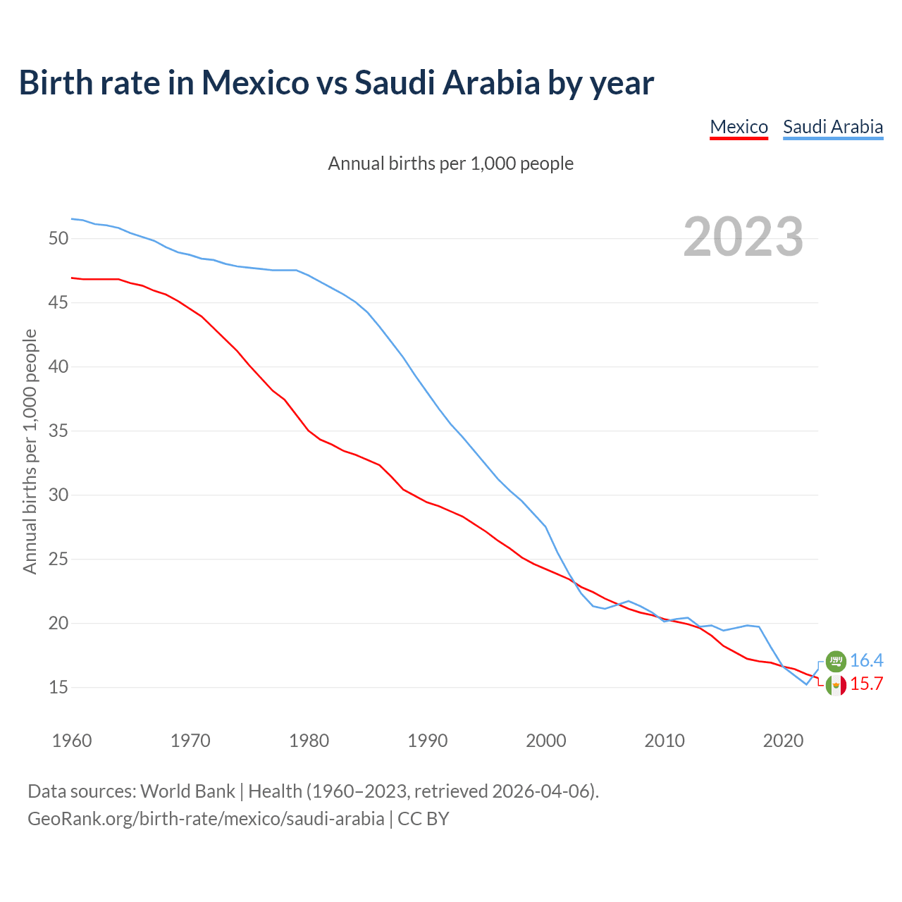 Mexico has an annual birth rate of 15.7 births per 1,000 people, compared to 16.4 for Saudi Arabia. The average number of children a woman is expected to have during her lifetime — the fertility rate, is 1.91 in Mexico and 2.28 in Saudi Arabia — 19.4% difference.