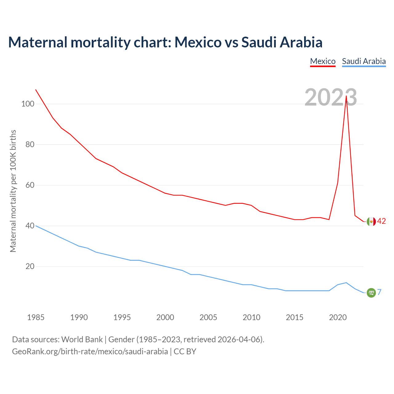 The maternal mortality rate, which is the probability of dying during childbirth or within 42 days of pregnancy termination, is 42 deaths per 100,000 live births in Mexico, compared to 7 deaths in Saudi Arabia.