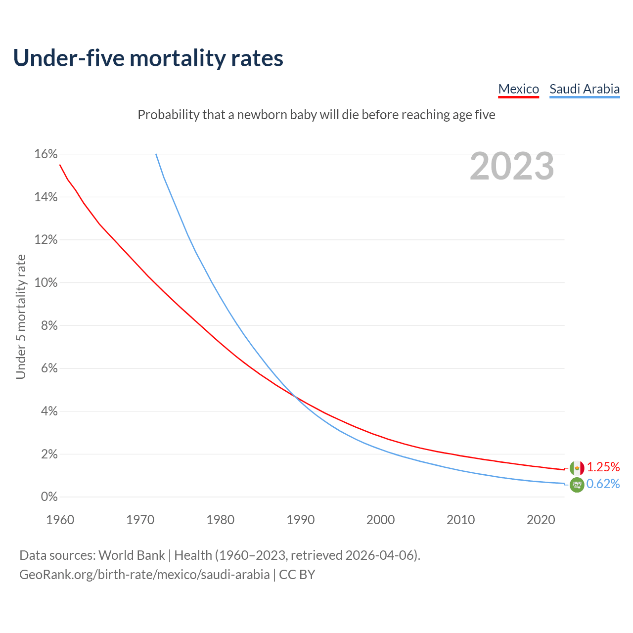 The chance that a newborn baby will die before reaching age five is 1.25% in Mexico and 0.62% in Saudi Arabia. Above is a chart with historical data on under-five mortality rates.