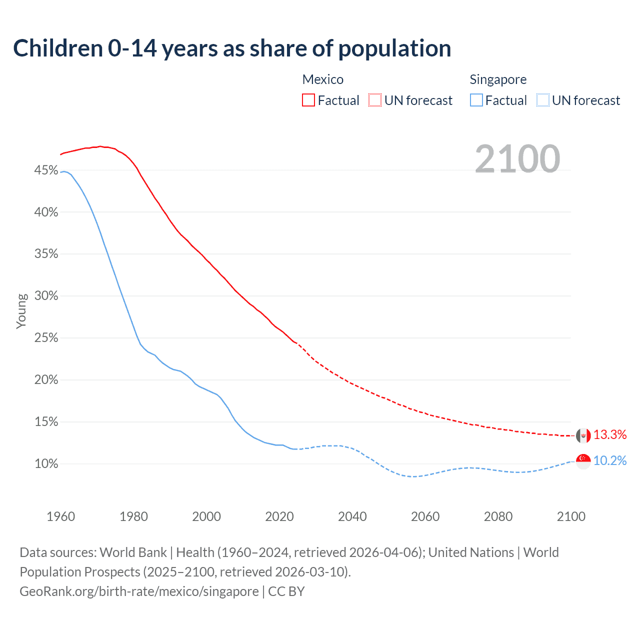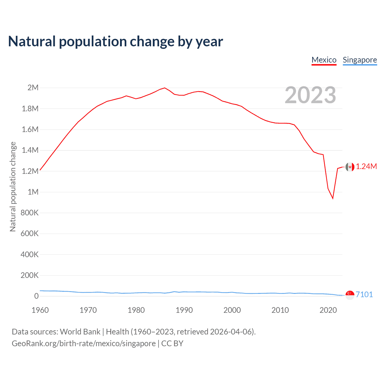 According to the latest available data on birth rates, the fertility rate in Mexico was 1.91 children per woman in 2023, compared to 0.97 in Singapore in 2023. The replacement level is considered to be 2.1 children per woman.