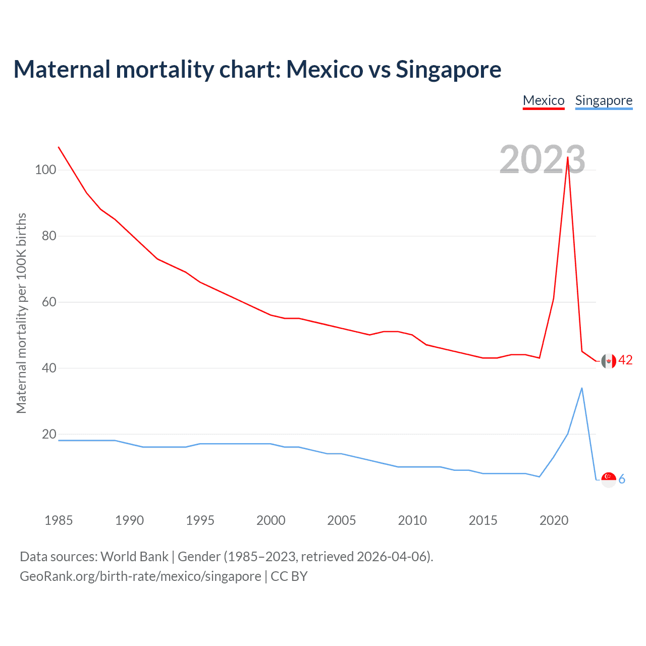 The maternal mortality rate, which is the probability of dying during childbirth or within 42 days of pregnancy termination, is 42 deaths per 100,000 live births in Mexico, compared to 6 deaths in Singapore.