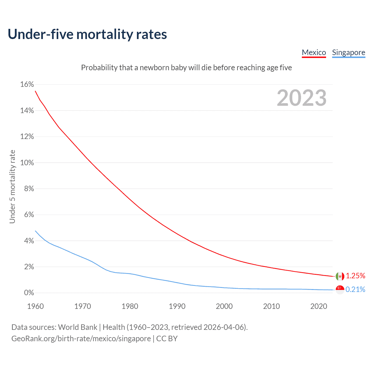 The chance that a newborn baby will die before reaching age five is 1.25% in Mexico and 0.21% in Singapore. Above is a chart with historical data on under-five mortality rates.