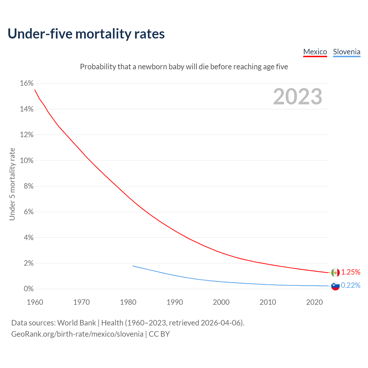 The chance that a newborn baby will die before reaching age five is 1.25% in Mexico and 0.22% in Slovenia. Above is a chart with historical data on under-five mortality rates.