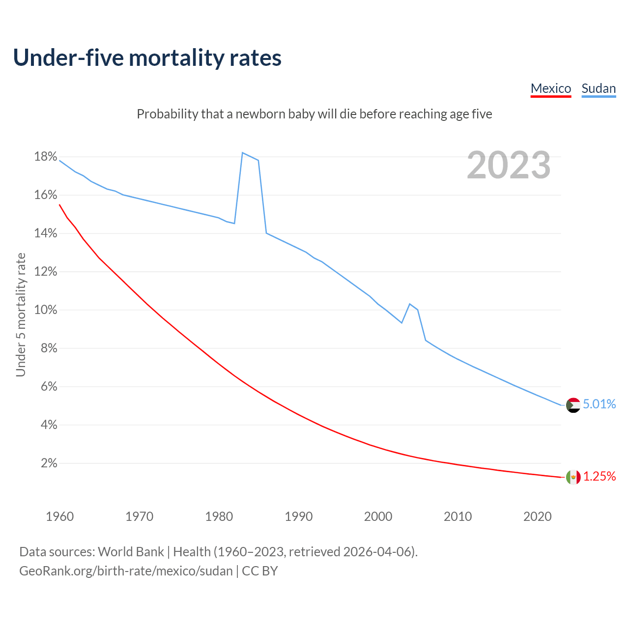 The chance that a newborn baby will die before reaching age five is 1.25% in Mexico and 5.01% in Sudan. Above is a chart with historical data on under-five mortality rates.