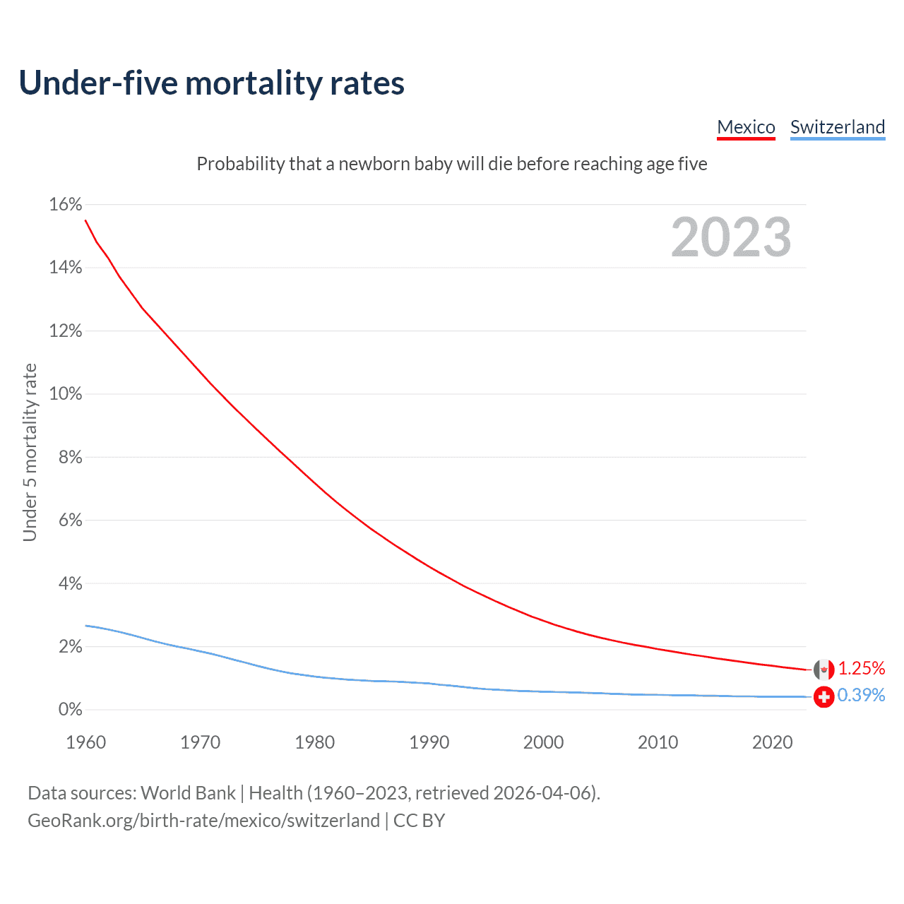 The chance that a newborn baby will die before reaching age five is 1.25% in Mexico and 0.39% in Switzerland. Above is a chart with historical data on under-five mortality rates.
