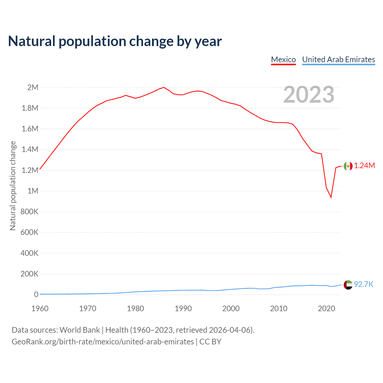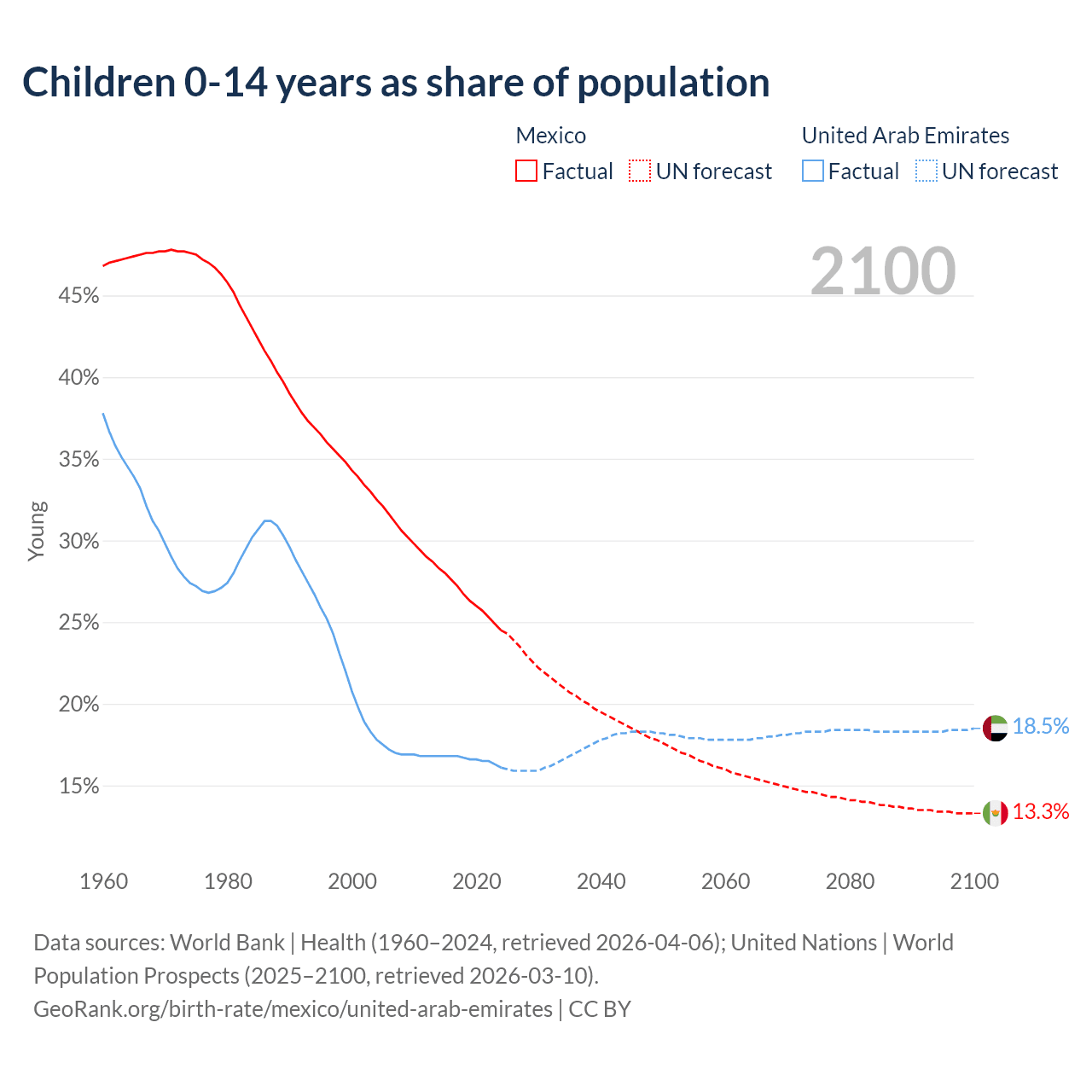 Mexico has an annual birth rate of 15.7 births per 1,000 people, compared to 9.77 for the United Arab Emirates. The average number of children a woman is expected to have during her lifetime — the fertility rate, is 1.91 in Mexico and 1.2 in the United Arab Emirates — 37.2% difference.