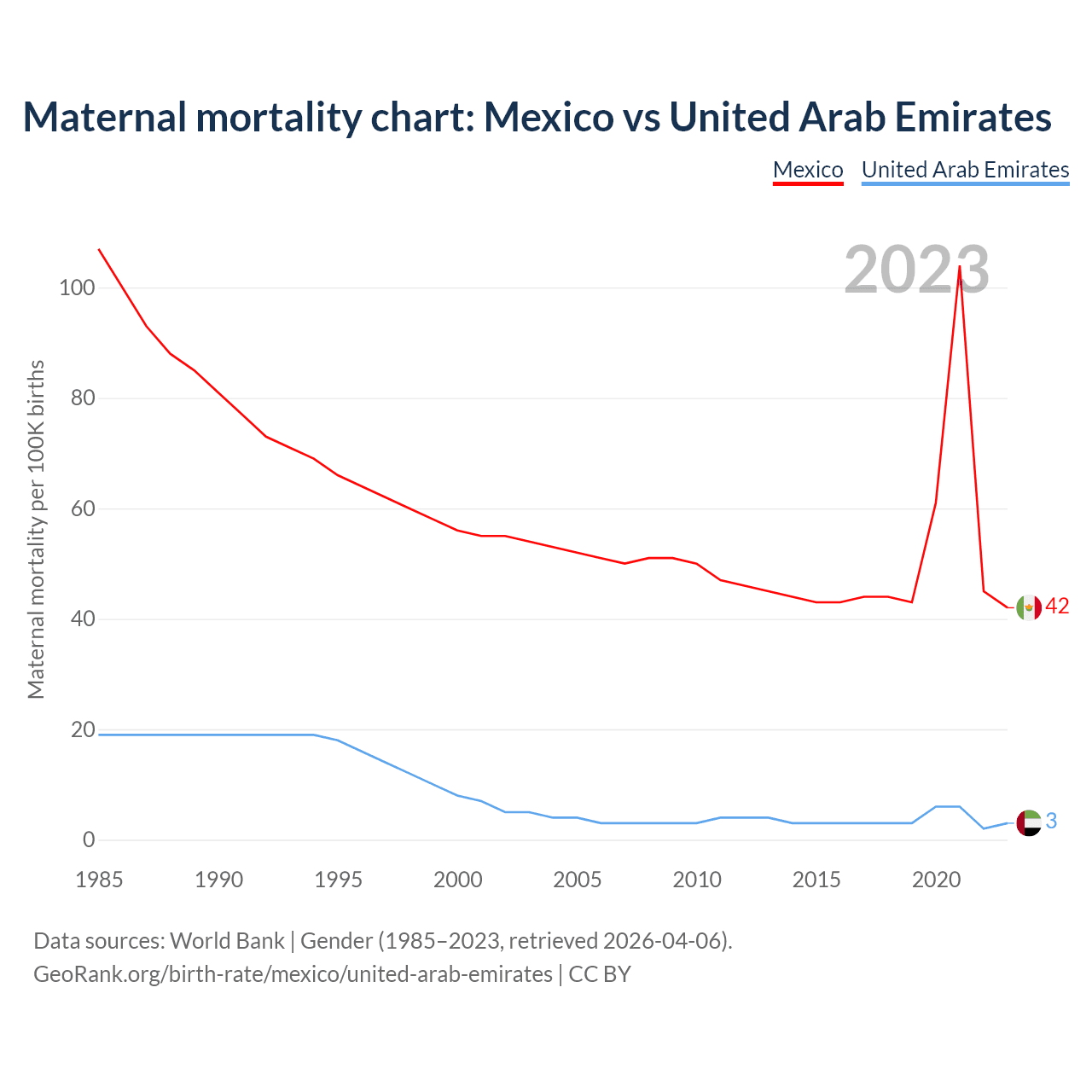 The maternal mortality rate, which is the probability of dying during childbirth or within 42 days of pregnancy termination, is 42 deaths per 100,000 live births in Mexico, compared to 3 deaths in the United Arab Emirates.
