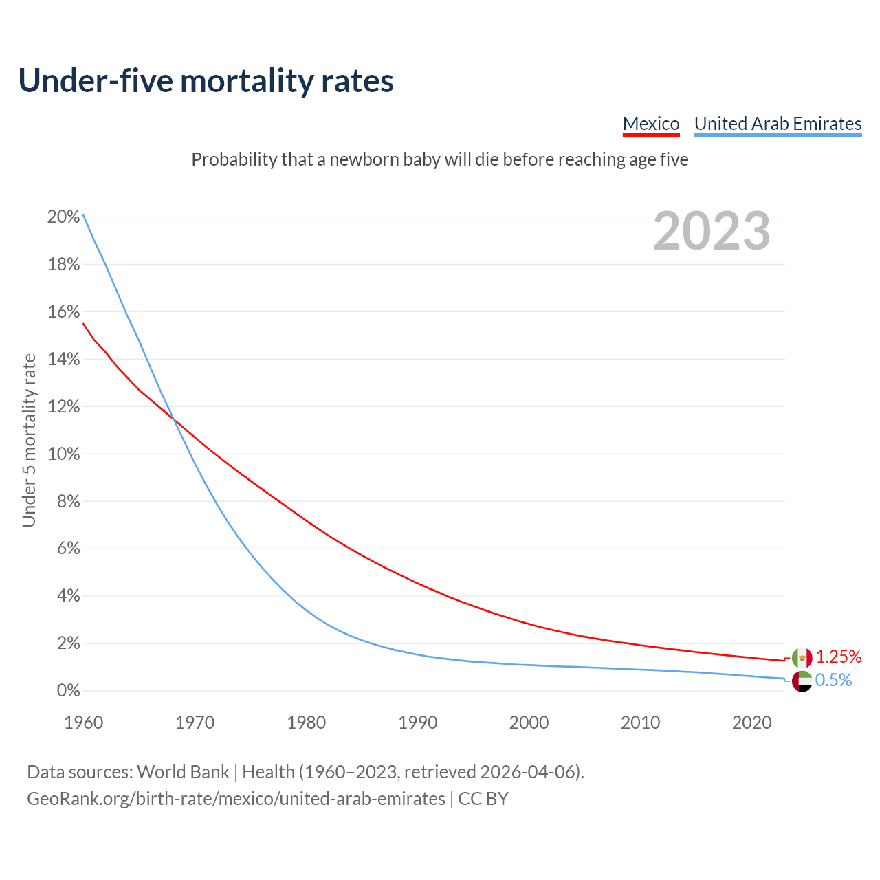 The chance that a newborn baby will die before reaching age five is 1.25% in Mexico and 0.5% in the United Arab Emirates. Above is a chart with historical data on under-five mortality rates.