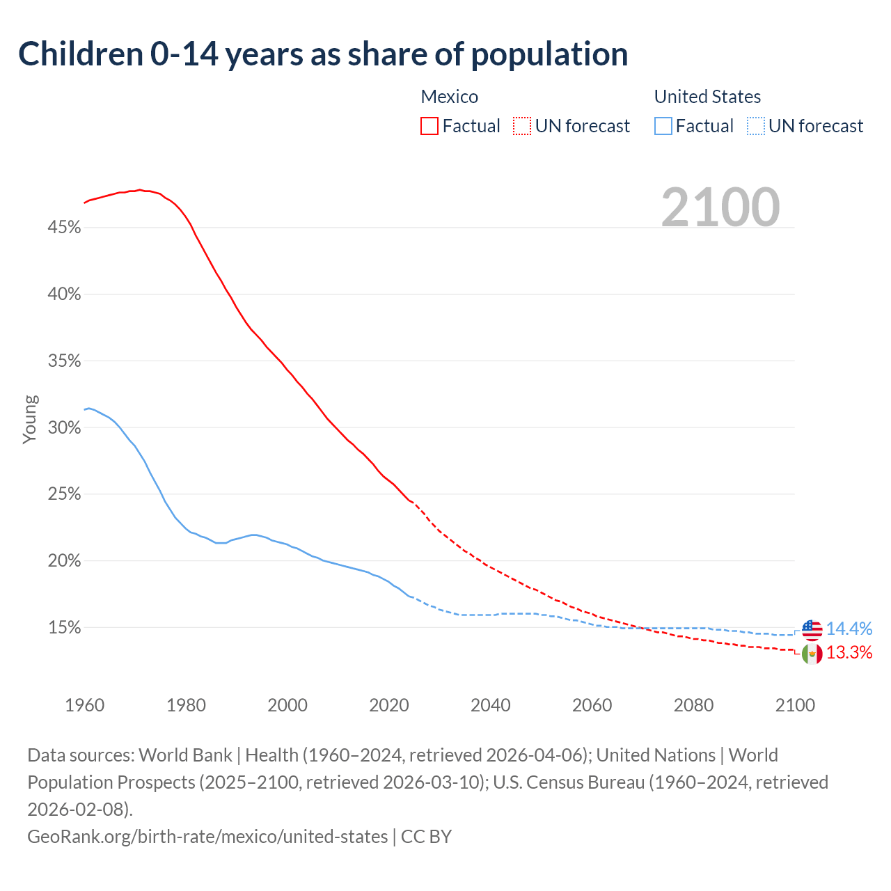 According to the latest available data on birth rates, the fertility rate in Mexico was 1.91 children per woman in 2023, compared to 1.62 in the United States in 2023. The replacement level is considered to be 2.1 children per woman.