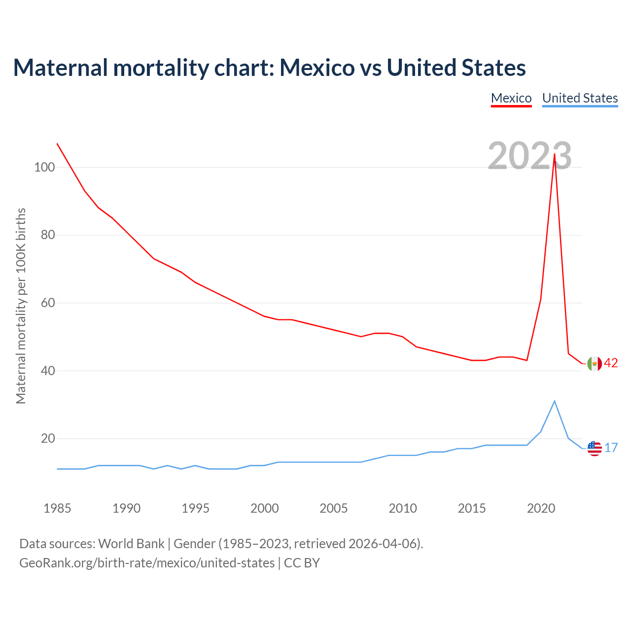 The maternal mortality rate, which is the probability of dying during childbirth or within 42 days of pregnancy termination, is 42 deaths per 100,000 live births in Mexico, compared to 17 deaths in the United States.